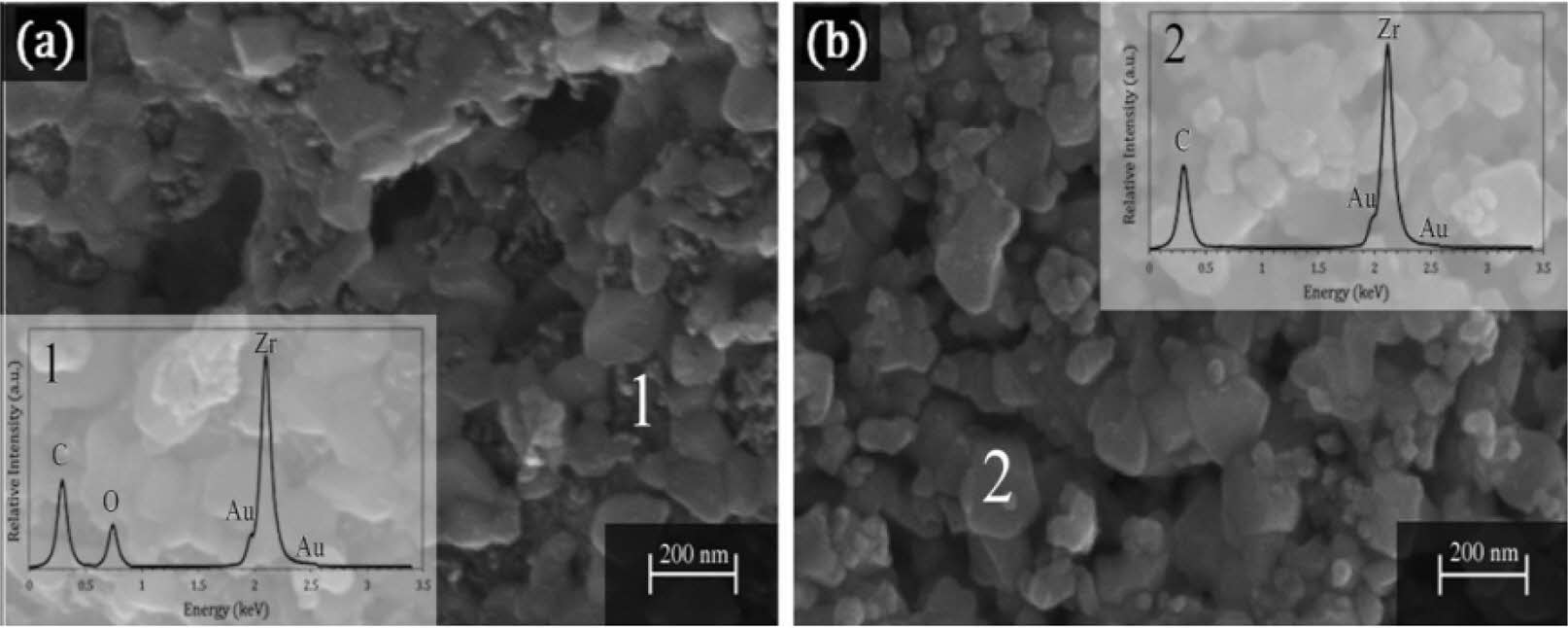 Fig. 7 SEM images and EDS spectra of ZrC sample heated in vacuum at: (a) 1200 and (b) 1400 ℃ [40] |