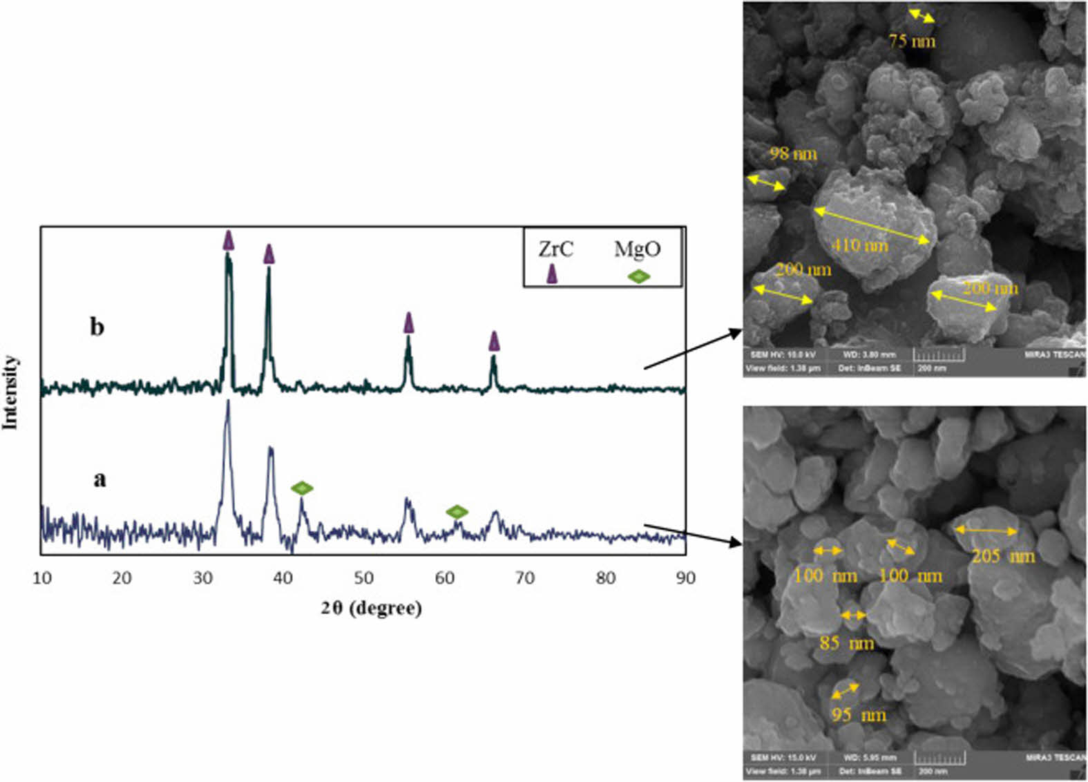 Fig. 9 X-ray diffraction patterns and FE-SEM images of the ZrC prepared by mechanochemical synthesis (30 h milled): (a) before leaching, (b) after leaching [44]. |