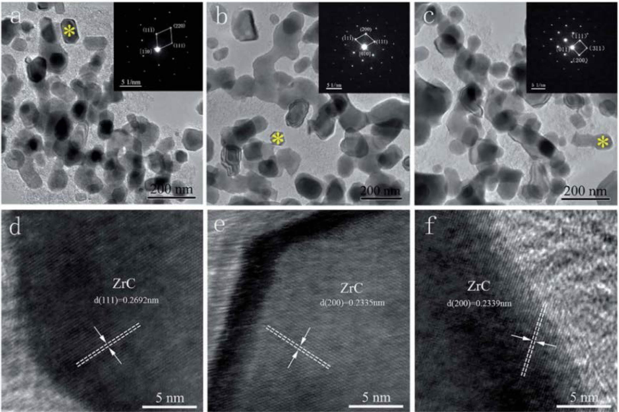 Fig. 11 TEM, HRTEM and SAED images of ZrC powder synthesized from precursors in different proportions [47]. |