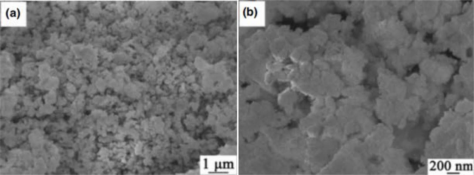 Fig. 14 SEM photos of ZrB2 transformed from the precursor: (a) low magnification, (b) large magnification [50]. |