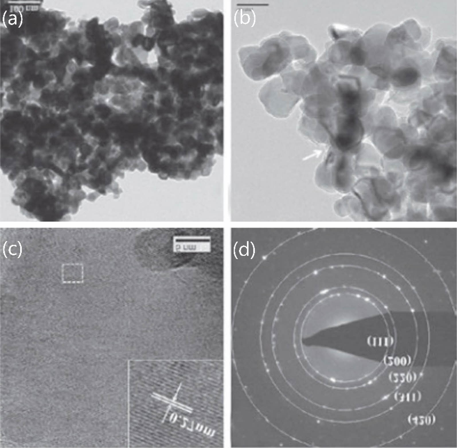 Fig. 15 Typical TEM (a, b), HRTEM (c), and SAED (d) images of ZrC powder was prepared when the heat absorption rate was 40%. [25]. |