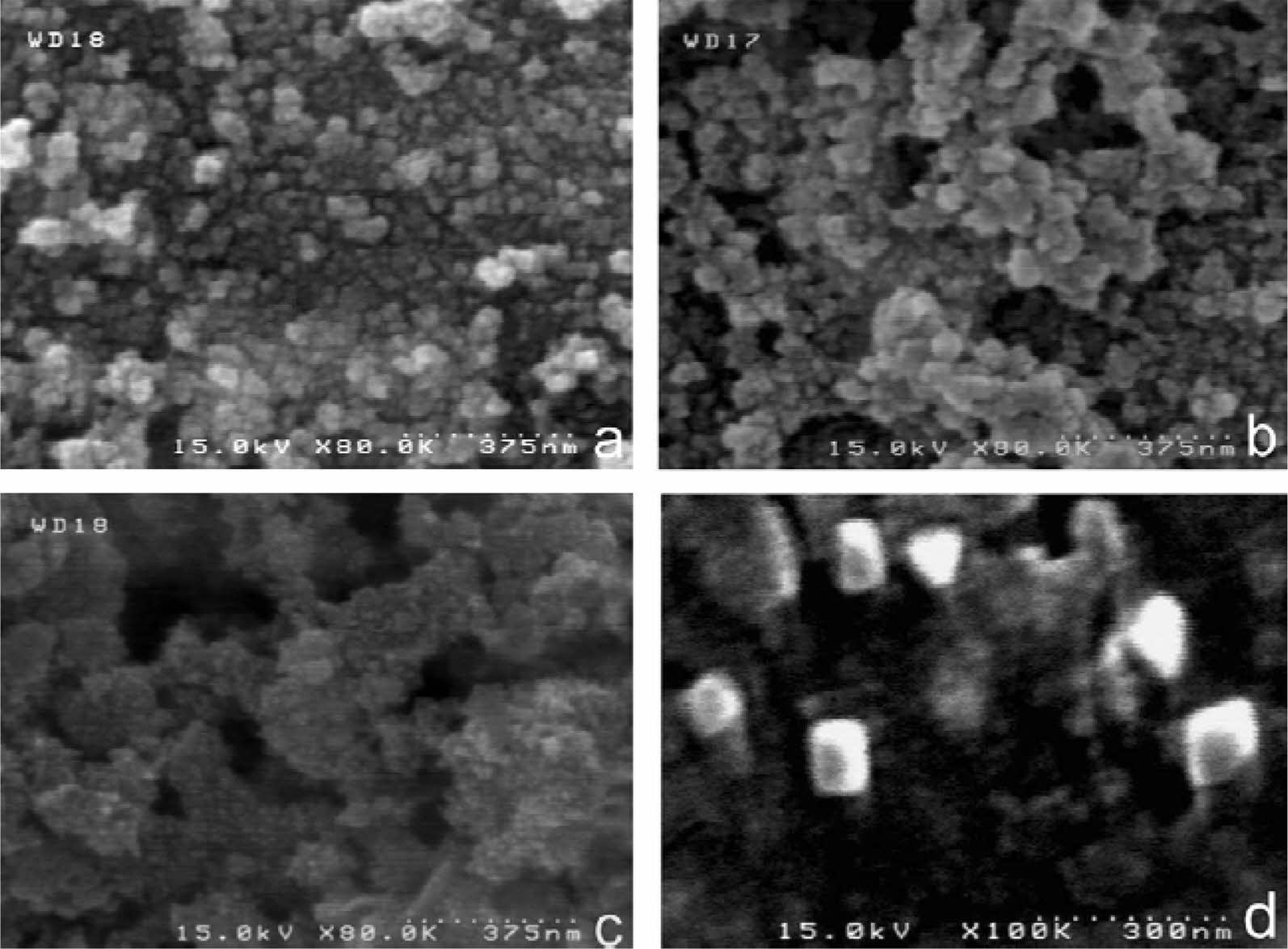 Fig. 18 SEM micrographs of combustion synthesis TiB2 with various amounts of 0.5KCl-0.25NaCl-0.25CaCl2 mixed salts: (a) 0%, (b) 30%, (c and d) 45% [101]. |