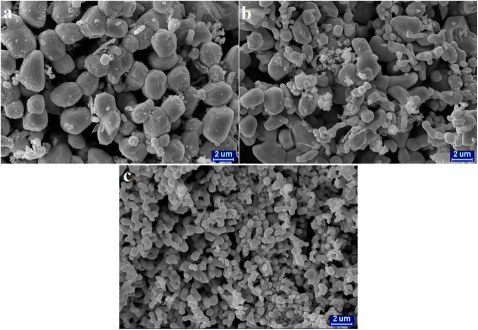 Fig. 19 SEM micrographs of ZrB2 obtained by adding different additional Mg concentrations: (a) y = 2.5, (b) y = 4.5, (c) y = 9 [102]. |