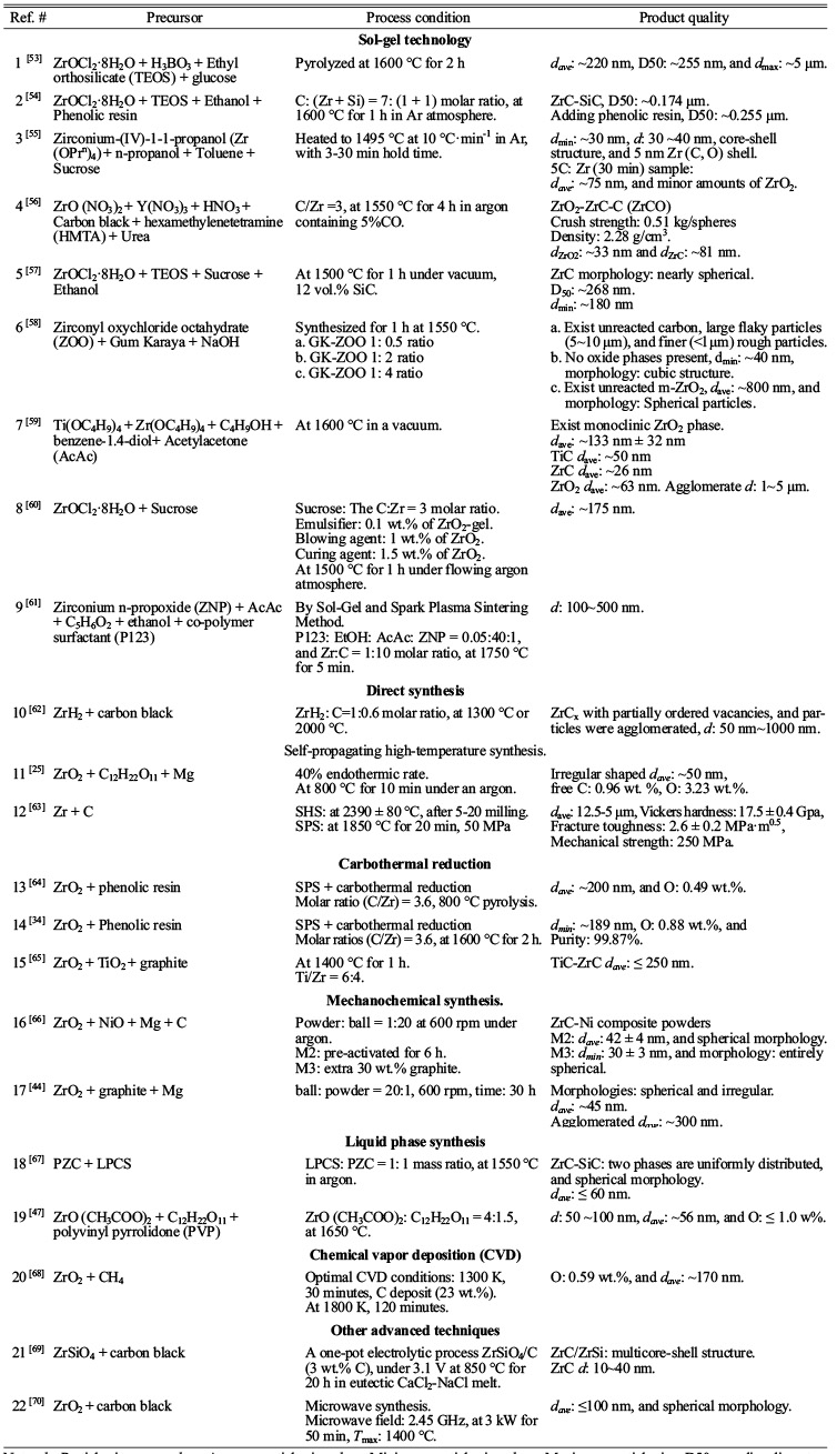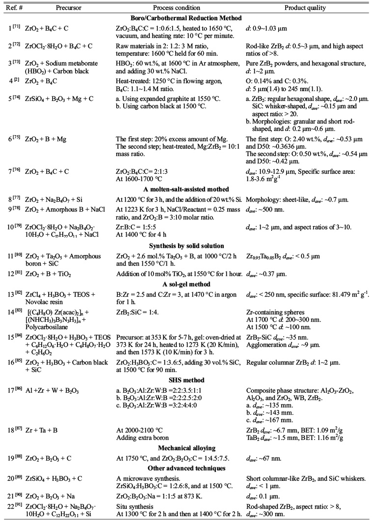 Each preparation method has its advantages and disadvantages, which are summarized in the Table 1. The specific examples of ZrC and ZrB2-based ceramics prepared by different methods are summarized in Table 2 and 3.