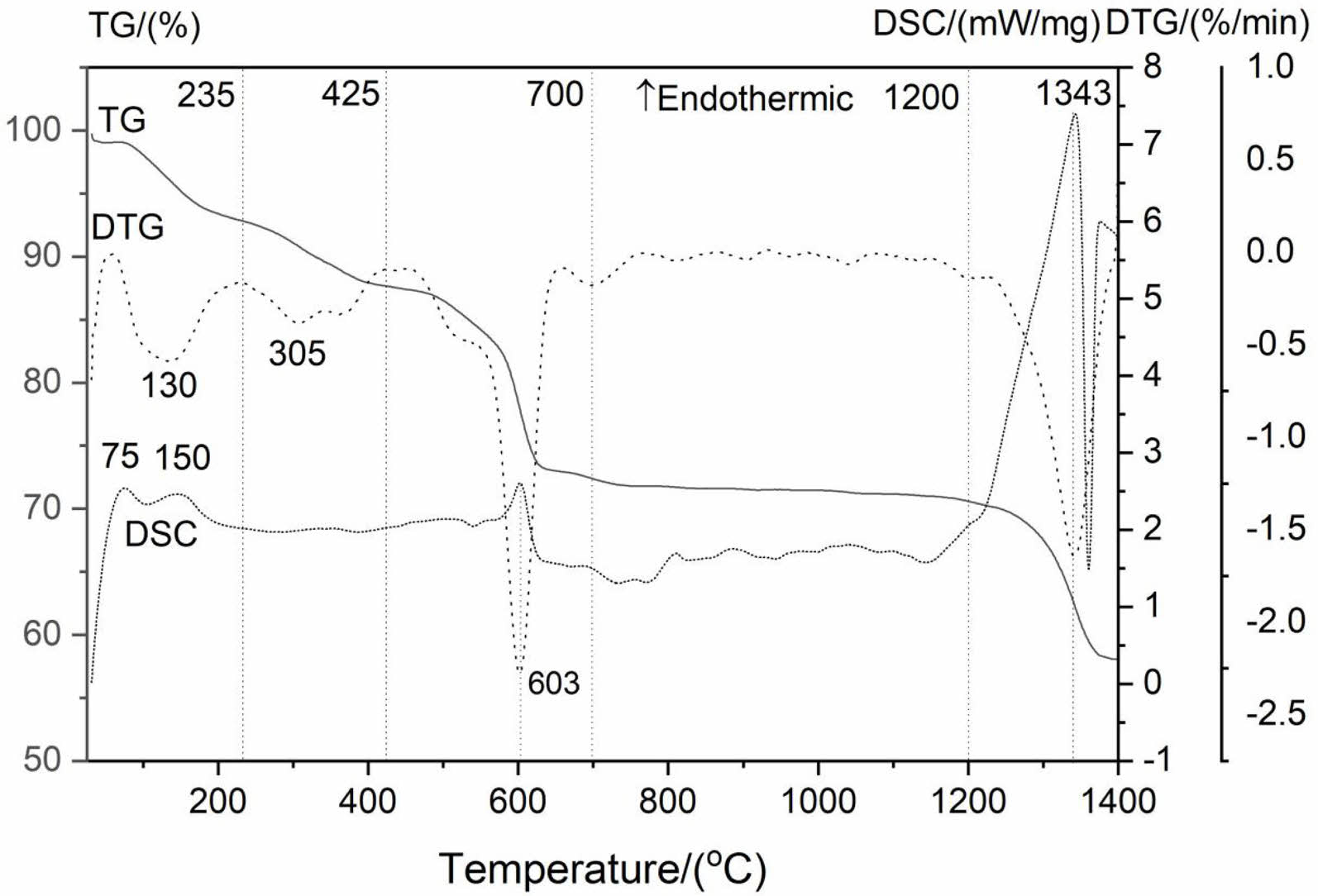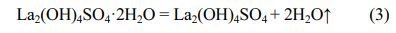 The third weight loss is 15.28 wt%, and DTG maximum and endothermic peak values are both located at ~603 °C. The weight loss between ~425 °C and ~700 °C is due to the removal of OH- group of the La2(OH)4SO4, corresponding to the equation (4).
