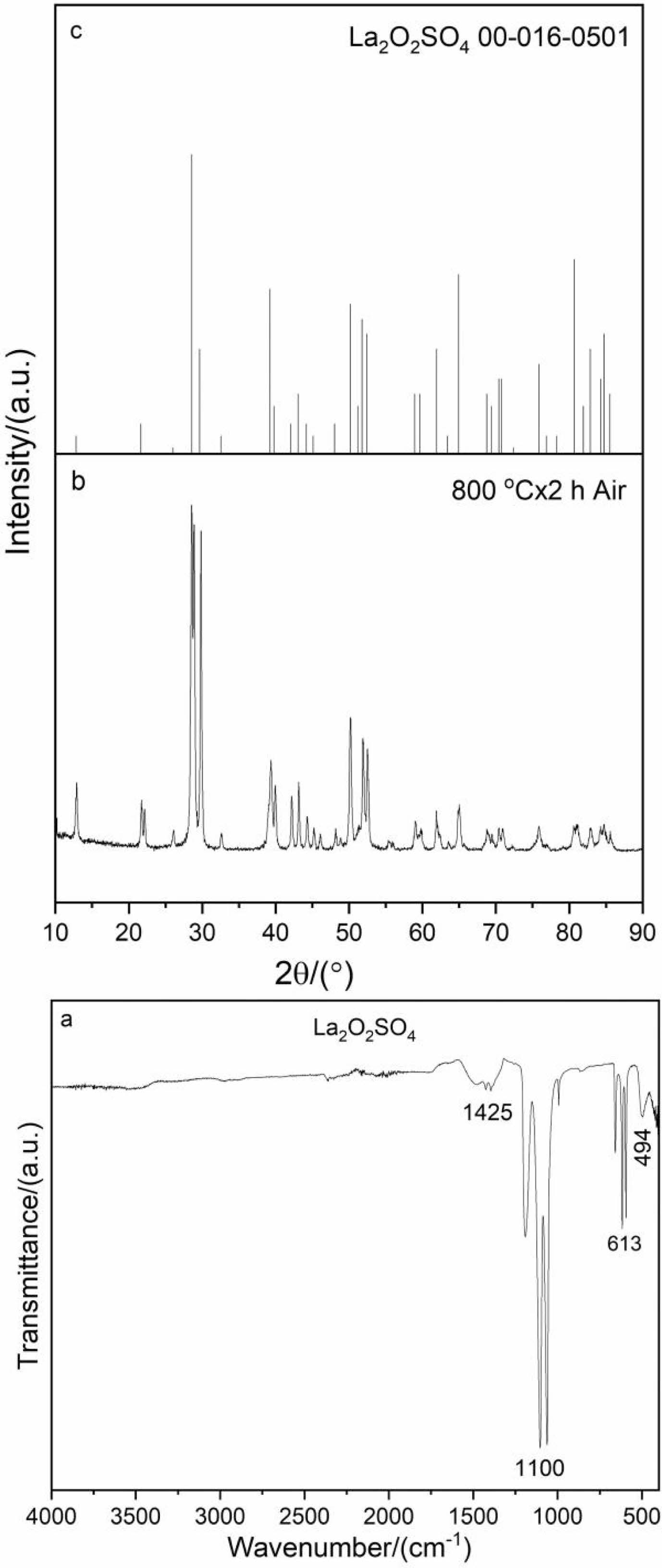 The FTIR spectrum and XRD pattern of the intermediate product (800 oC, 2 h) were shown in Fig. 4. As shown in Fig. 4a, the intermediate product exhibits essential change compared with FTIR spectrum of the precursor (Fig. 2a). The lack of some absorption peaks at 3596, 3480, 3253 and 1664 cm-1 illustrates that hydroxy water, crystal water and adsorbed water molecules have removed from the intermediate product. The characteristic absorption peaks of sulfate, on the other hand, can still be clearly observed, but are significantly different from those of the precursor. Moreover, the vibration peak of La-O bond at ~494 cm-1 appears in the FTIR spectrum. It should be noted that the weak peak of the intermediate product at 1425 cm-1 belonging to the absorption of CO32- group is attributed to the absorption of water (H2O) and carbon dioxide (CO2) on the sample surface from the environment. The FTIR results are in accordance with the DSC-TG-DTG and XRD analysis (Fig. 3 and 4b). Notably, the sharp diffraction peaks in the XRD pattern (Fig. 4b) can be indexed well with the data of the La2O2SO4 standard JCPDS card (No.00-016-0501, Fig. 4c), indicating that pure La2O2SO4 phase is synthesized.