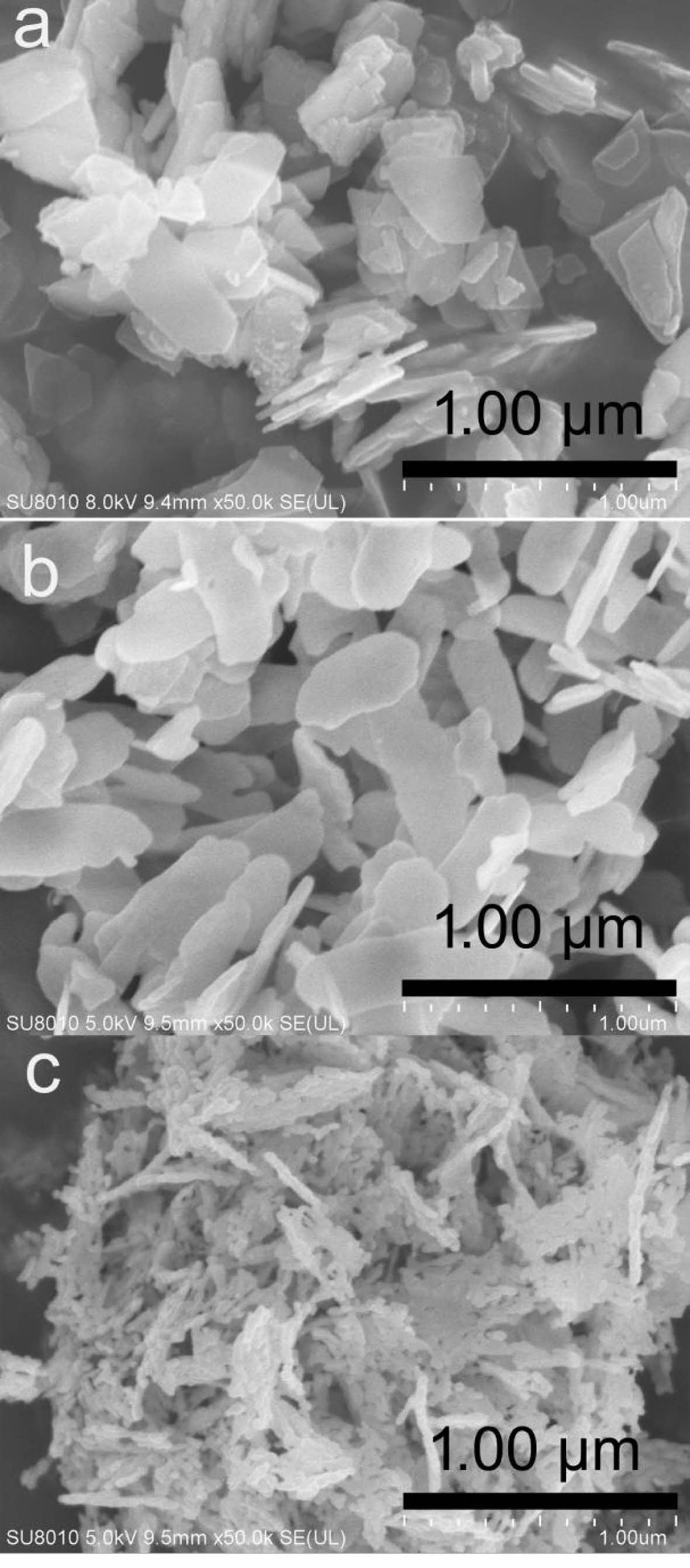 The FESEM morphologies of (a) the precursor, (b) La2O2SO4 and (c) La2O2S were depicted in Fig. 6. As seen from Fig. 6a, the precursor derived from co-precipitation process displays a laminar shape with the side length in sub-micrometer scale (300-500 nm) and thicknesses of nanometer scale (20-50 nm). In this work, the formation of the laminar precursor may be attributed to its crystal growth habit, resulting from its layered crystal structure. Compared with that of the precursor flakes, it is obvious from Fig. 6b that the laminar La2O2SO4 structure could be well maintained by inheriting the precursor’s shape. The size of the flakes does not change significantly, but the edges and corners of La2O2SO4 are more rounded. Moreover, it can be seen from Fig. 6c that the laminar La2O2SO4 flakes are fractured into fine La2O2S nanoparticles with the size of 20-50 nm, which exhibits a nanometer-sized rice ear-like structure (Fig. 6c). This may be due to the fragmentation of laminar La2O2SO4 under the action of high-temperature water vapor, which is produced by La2O2SO4 and hydrogen reduction reaction. The fractured La2O2S nanoparticles have high surface energy and tend to form rice ear-like aggregates in order to achieve a relatively stable structure.