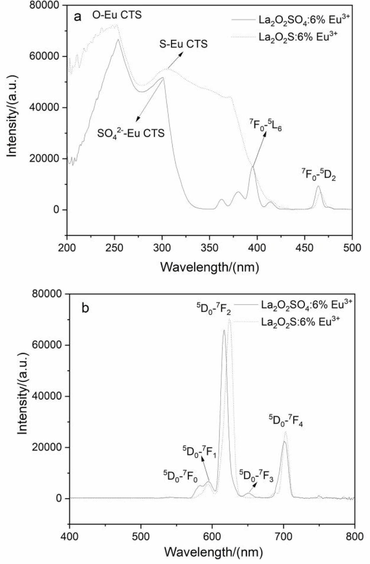 The excitation (a) and emission spectra (b) of La2O2SO4:6%Eu3+ phosphor and La2O2S:6%Eu3+ nanophosphor were displayed in Fig. 7. The broad excitation band is assigned to the charge transfer state (CTS) transition of Eu3+ ions, that is O-Eu CTS (254 nm) and SO42--Eu CTS (301 nm). As labeled in Fig. 7a, other peaks were observed at 397 nm for the 7F0→5L6 and at 465 nm for the 7F0→5D2 intra-4f6 transitions of Eu3+. For La2O2S:6%Eu3+ nanophosphor, a strong excitation band with the maximum at 254 nm and a broad charge transfer state (S-Eu) transition in the range of 300-400 nm were presented in excitation spectra. The broad absorption band can expand the light-absorbing capacity of the phosphor, which is beneficial to improve the emission intensity. Under 254 nm excitation, the prominent peaks of La2O2SO4: 6%Eu3+ phosphor and La2O2S:6%Eu3+ nanophosphor are located at 617 nm and 624 nm, respectively (Fig. 7b), which both correspond to the 5D0→7F2 transition of Eu3+ ions. Additionally, these two peaks confirm the formation of oxysulfate and oxysulfide host. However, compared with La2O2SO4:6%Eu3+ phosphor, La2O2S: 6%Eu3+ nanophosphor exhibits stronger emission intensity, which is related to its strong absorptivity at 254 nm. In addition, the asymmetrically split weak emission peaks in the range of 580-600 nm are assigned to the 5D0→7Fn (n=0,1) transitions of Eu3+ ions in two lanthanium-based hosts lattices. The 5D0→ 7F3 transition of Eu3+ ions was found at 650 nm, and the 5D0→7F4 transition at 703 nm was observed in La2O2SO4:6%Eu3+ phosphor (Fig. 7b). The very shallow shoulder at 580 nm is assigned to the 5D0→7F0 transition of Eu3+ ions. The appearance of 5D0→7F0 transition suggests that the Eu3+ ions occupy lattice sites of low centrosymmetries for La2O2SO4:6%Eu3+ phosphor and partly support Eu3+ ions occupy C3V site for La2O2S:6%Eu3+ nanophosphor [35].