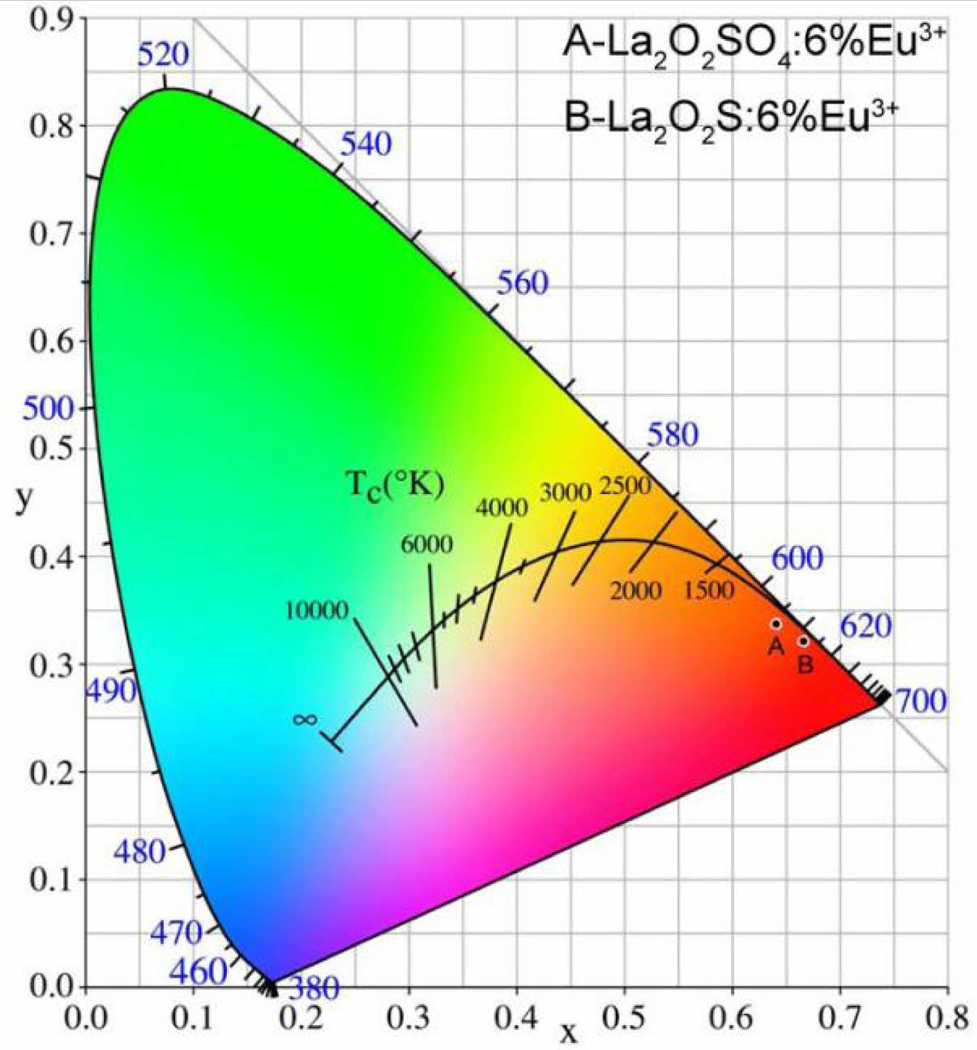 The CIE (x,y) coordinates were calculated by CIE 1931 chromaticity coordinate calculation software according to PL emission data. The CIE coordinates of La2O2SO4:6%Eu3+ phosphor and La2O2S:6%Eu3+ nanophosphor are (0.6412, 0.3380) and (0.6669, 0.3214), respectively, as displayed in Table 1. The CIE chromaticity diagram of La2O2SO4:6%Eu3+ phosphor (A) and La2O2S:6%Eu3+ (B) nanophosphor were presented in Fig. 8. As labeled in Fig. 8, compared with La2O2SO4:6%Eu3+ phosphor, La2O2S:6%Eu3+ nanophosphor has a redder ingredient in its emission, indicating that La2O2S:6%Eu3+ nanophosphor is in the deep red region with good red-light purity and excellent color saturation. Moreover, the correlated color temperature (CCT) is determined by McCamy's approximate equation (7) and (8) [36].