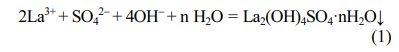 At room temperature, K is a constant. Here, [La3+] and [SO42-] were constant values in this experiment, and thus [OH-] is a critical factor for this precipitation reaction. With continuous drops of aqueous ammonia, increase the concentration of OH- groups gradually increases, and finally it breaks the equilibrium between these La3+ ions and groups (SO42- and OH-). Therefore, the precipitation reaction (1) occurs. The pH curve shows an approximate plateau around 8.05~9.35, due to the complete reaction between La3+ ions and anionic groups (OH- and SO42-). After adding 10 mL ammonia into the solution, the pH value of the supernatant reaches 9.35. In this work, 10 mL NH3·H2O is considered the best ammonia volume.