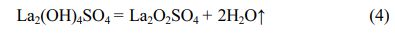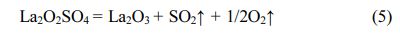 The equation (4) indicates that the La2O2SO4 product is formed in ~425 °C and ~700 °C temperature interval. The fourth weight loss of about 12.55 wt% is caused by the complete desulfurization reaction of the La2O2SO4 phase with an obvious endothermic peak and DTG maximum value at around 1343 °C. The thermal decomposition reaction is as follows: