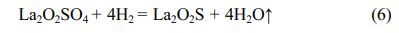 The intermediate La2O2SO4 was used to obtain the target La2O2S product via reduction at 800 oC for 1 h under reducing atmosphere. It is seen from the XRD pattern that all the diffraction peaks of the reduction product can be indexed as pure La2O2S phase (JCPD card No.00-027-0263) (Fig. 5). In 90%Ar/10%H2 reducing atmosphere, oxygen atoms from SO42- group in the La2O2SO4 host lattice can be trapped by hydrogen, while reducing S6+ to S2- at 800 oC to generate La2O2S phase [34]. The reduction reaction of La2O2SO4 by hydrogen at 800 oC is displayed as follows: