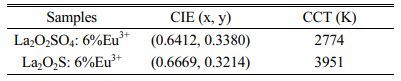 Table 1 The CIE coordinate and CCT value for the La2O2SO4: 6%Eu3+ phosphor and La2O2S:6%Eu3+ nanophosphor |
