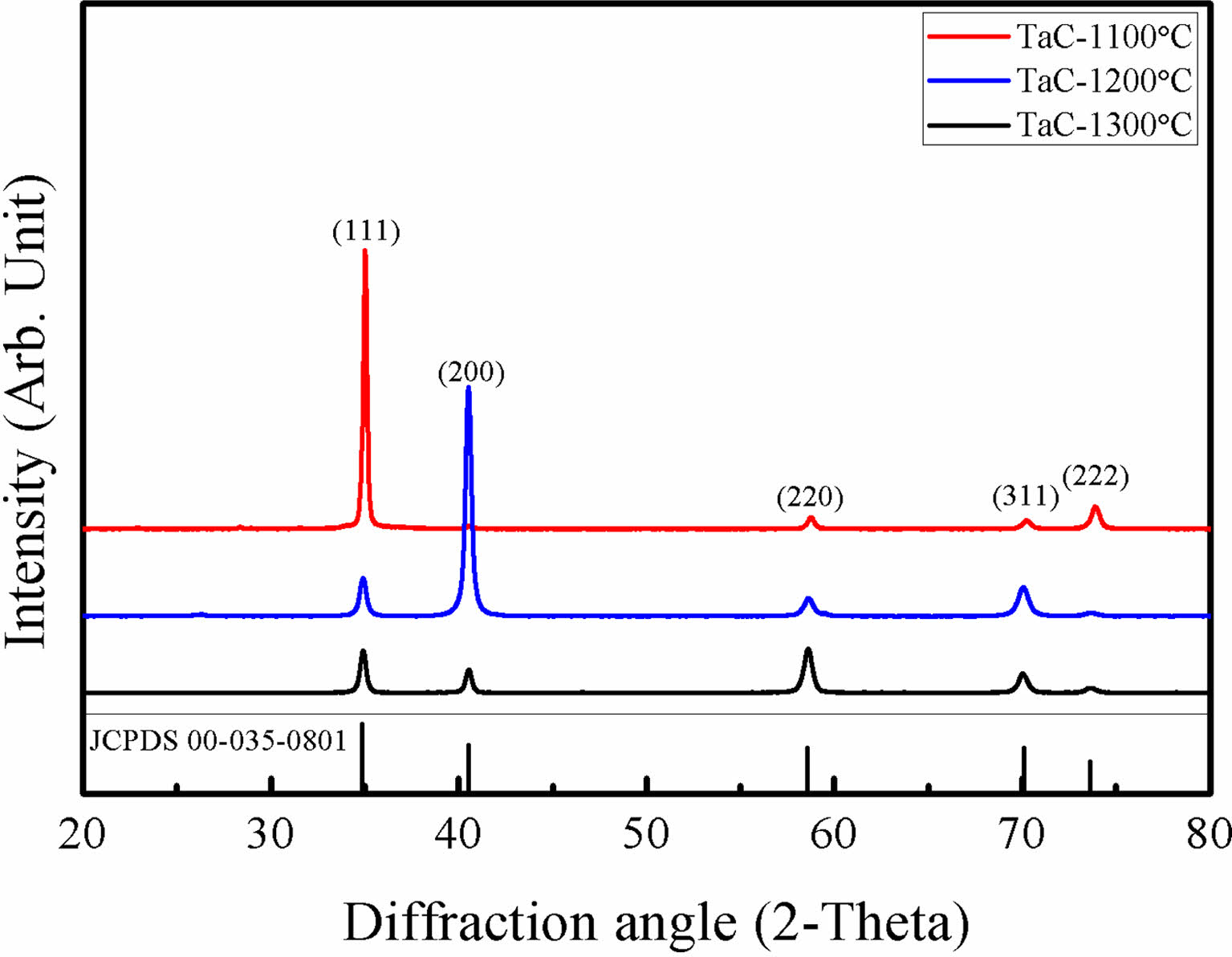 Fig. 1 XRD results of TaC with different deposition temperatures. |
