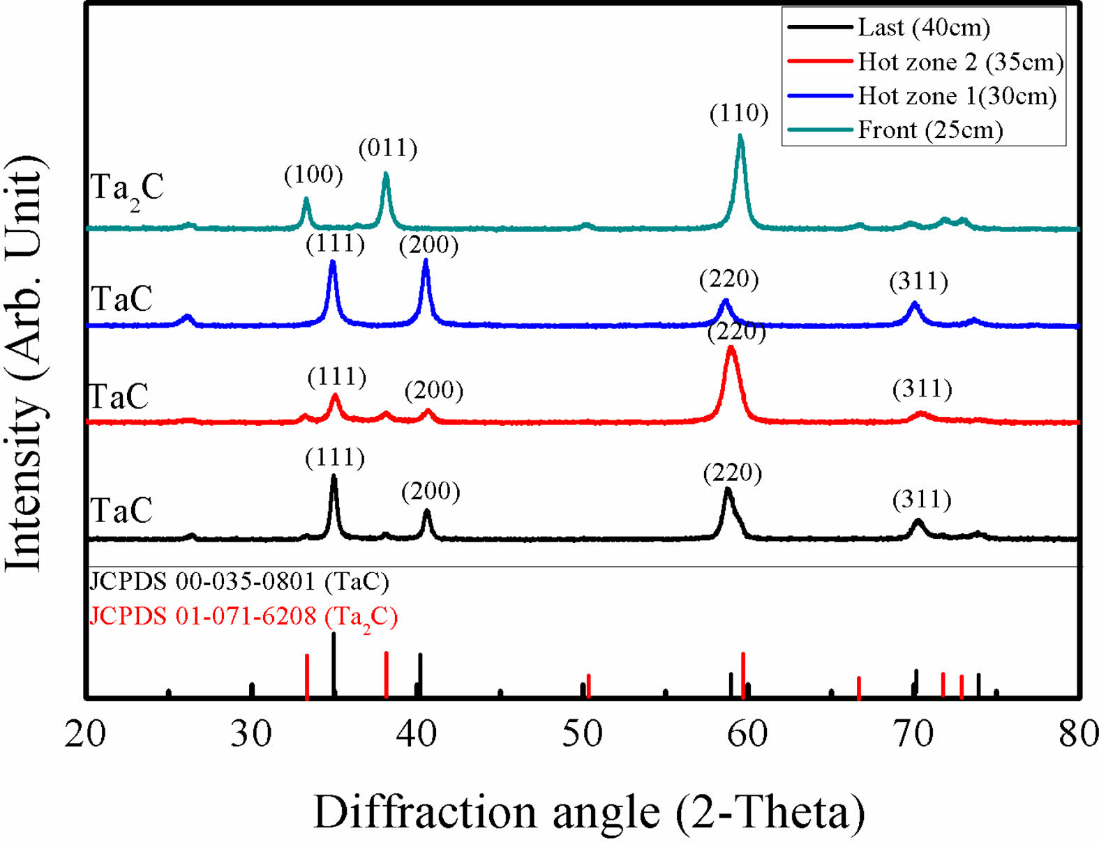 Fig. 3 XRD results of TaC deposited at different positions. |