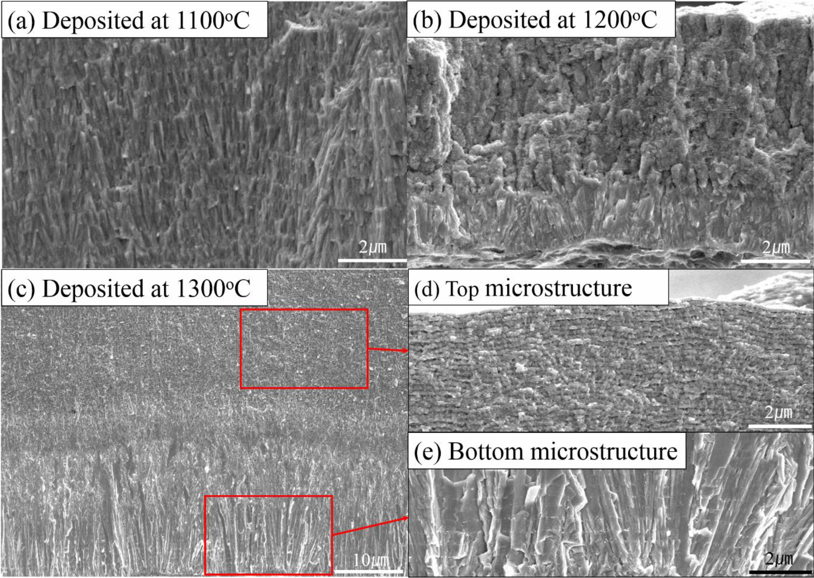 Fig. 4 Microstructure of chemical-vapor deposited at different positions. (a) TaC deposited at 1100 ºC, (b) TaC deposited at 1200 ºC, (c) Microstructure of deposition at 40cm away from gas inlet, (d) top microstructure of (c), (e) bottom microstructure of (c). |
