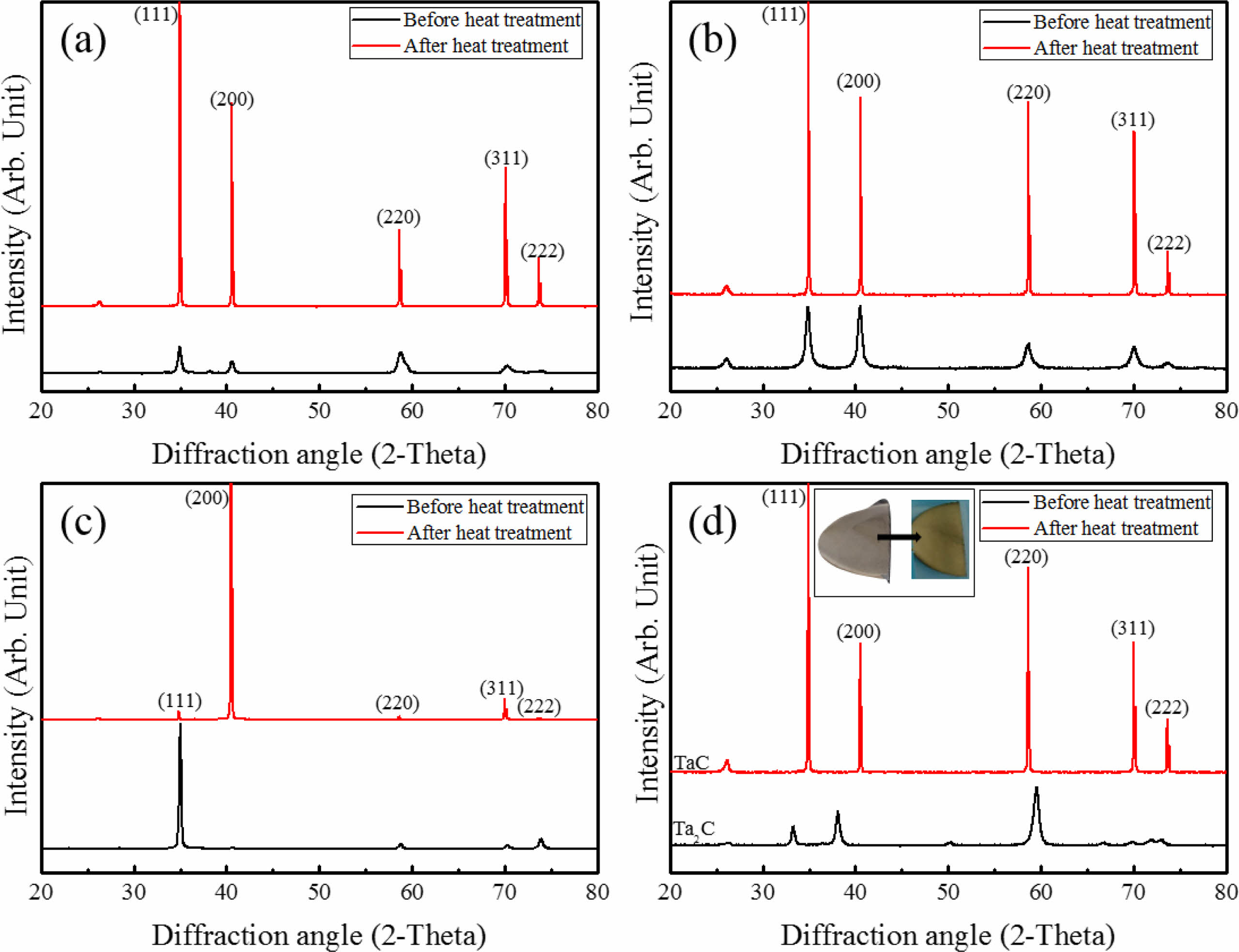 Fig. 6 XRD results before and after heat treatment. (a) TaC with random orientation (b) TaC with (200) slightly high orientation, (c) TaC with (111) high crystal orientation, (d) TaC deposited with Ta2C. |