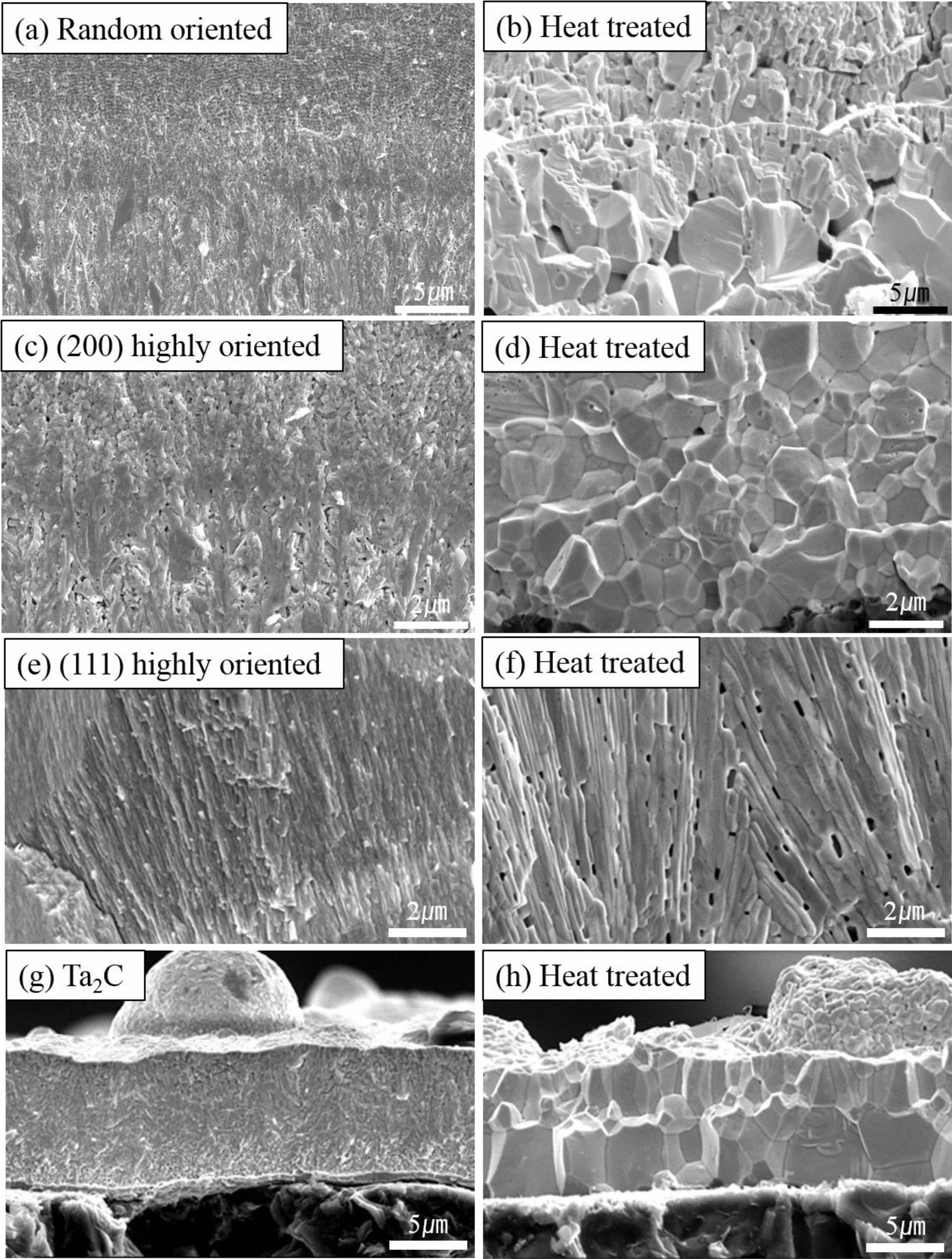 Fig. 7 Microstructures before and after heat treatment. (a) TaC with random orientation, (b) heat treated (a), (c) TaC with (200) slightly high oriented, (d) heat treated (c), (e) TaC with (111) highly oriented, (f) heat treated (e), (g) Ta2C phases, (h) heat treated (g). |