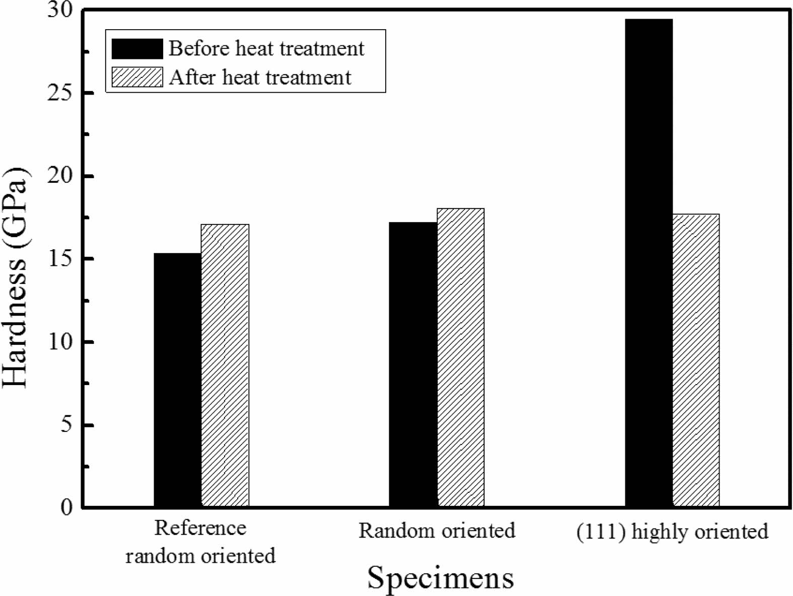 Hardness after heat treatment was compared with those of before (Fig. 8). The commercial reference TaC which was processed above 2100 oC was measured also and the random orientation TaC show average hardness. Heat treatment derived slightly increase of hardness. It was found that (111) highly oriented TaC has the highest hardness value before heat treatment. Hardness decreased and became similar to the average TaC hardness after heat treatment which could be affected by the micropores and orientation changes.