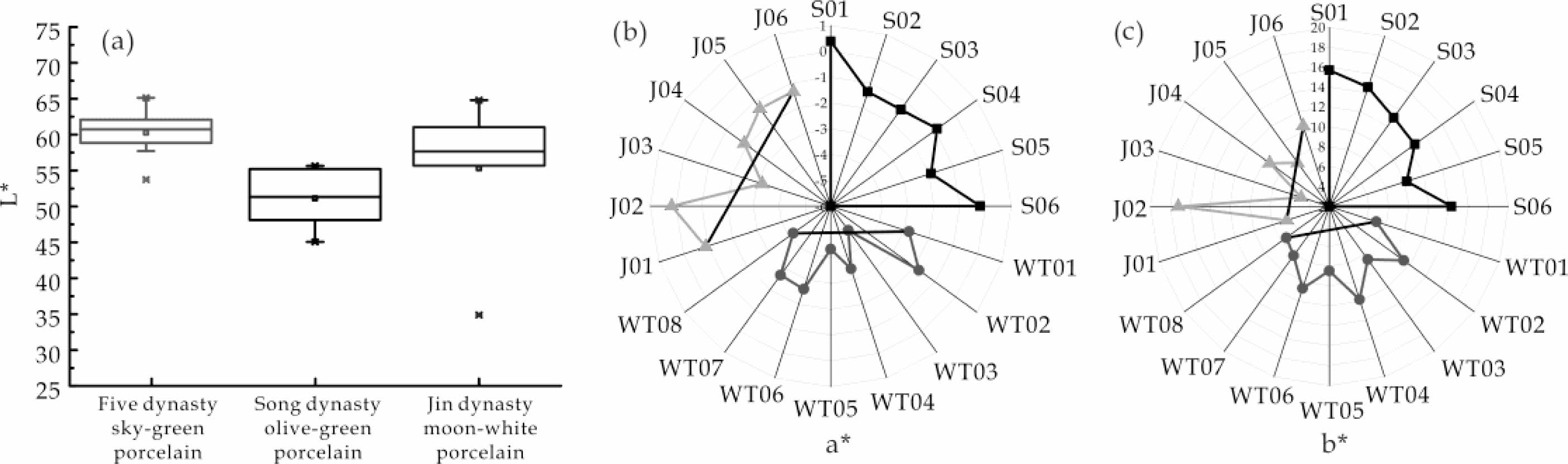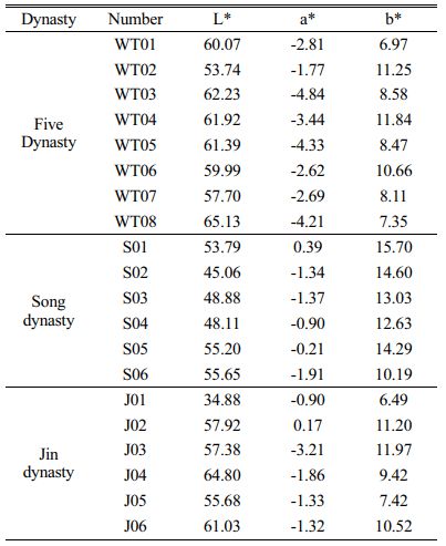 Table 2 and Figure 2 are the distribution maps of the L*, a*, and b* values of the celadon shards of the Five Dynasty, Song, and Jin dynasty of Yaozhou kiln, respectively. The L* value of the Five Dynasty sky-green wares in Yaozhou kiln is generally the most concentrated and highest (53-66); the lightness value of the Song dynasty olive-green glaze is generally the lowest but relatively scattered; and the L* value of the Jin dynasty moon-white glaze is between the Five Dynasty and the Song dynasty, close to the Five Dynasty celadon. It can be seen from the a* value radar distribution diagram in Fig. 2(b) that the glaze color of the Five Dynasty sky-green enamel is the greenest, followed by the Jin dynasty moon-white glaze, and then the Song dynasty olive-green glaze. Fig. 2(c) shows that the glaze color of the Five Dynasty samples is the bluest, the Song dynasty is yellowish, and the Jin dynasty is between the two. This is consistent with the previous research results of Zhen Sang et al. [9]. The L*, a*, and b* values of the celadon are related to the chemical compositions of the celadon glaze, the content, and the valence state of iron ions.