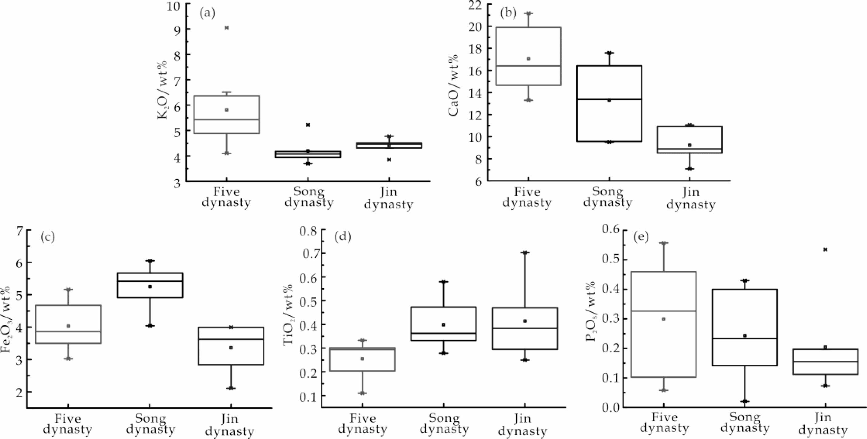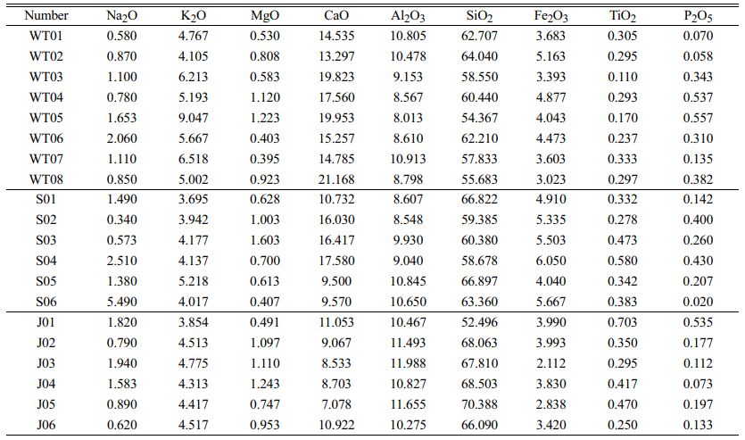 (1) The content of Fe2O3 in the Song dynasty olive-green, the Five Dynasty sky-green, and the Jin dynasty moon-white glazes of Yaozhou kiln successively decreased, which is the main reason for the gradual fading of their glaze colors. The higher content of K2O, CaO, and P2O5 in the Five Dynasty sky-green glaze is the main factor for its deep greenish-blue color.