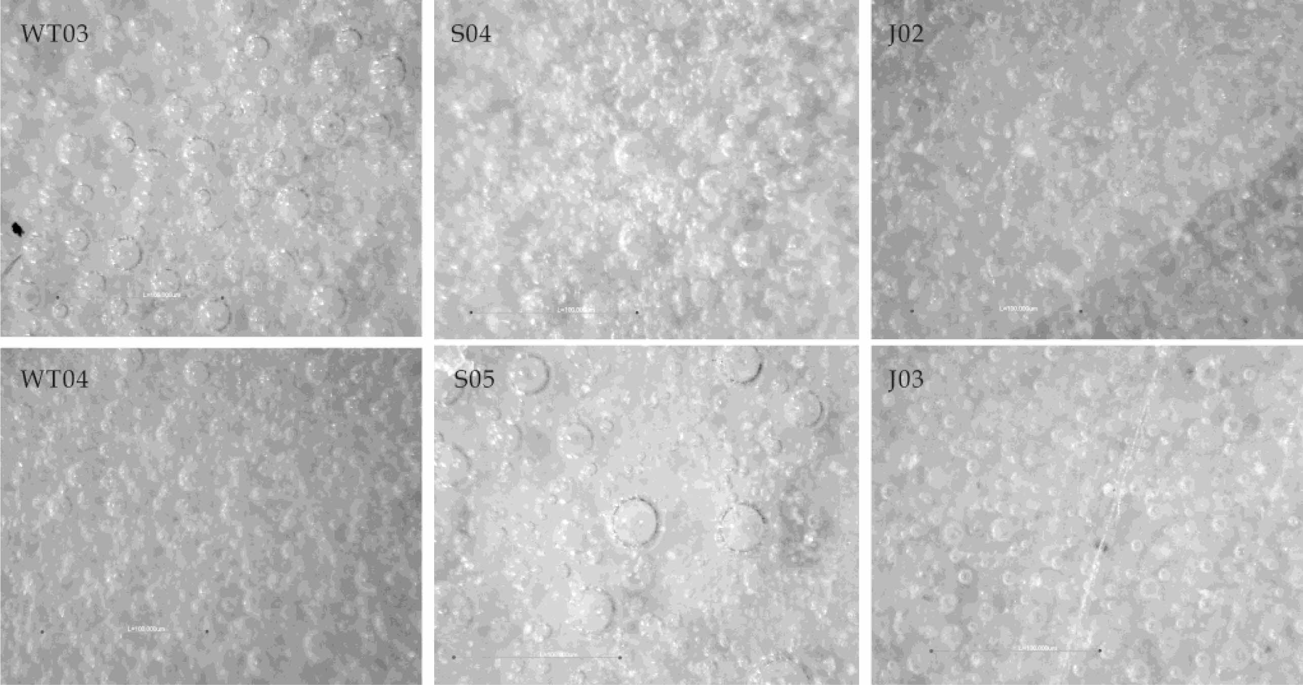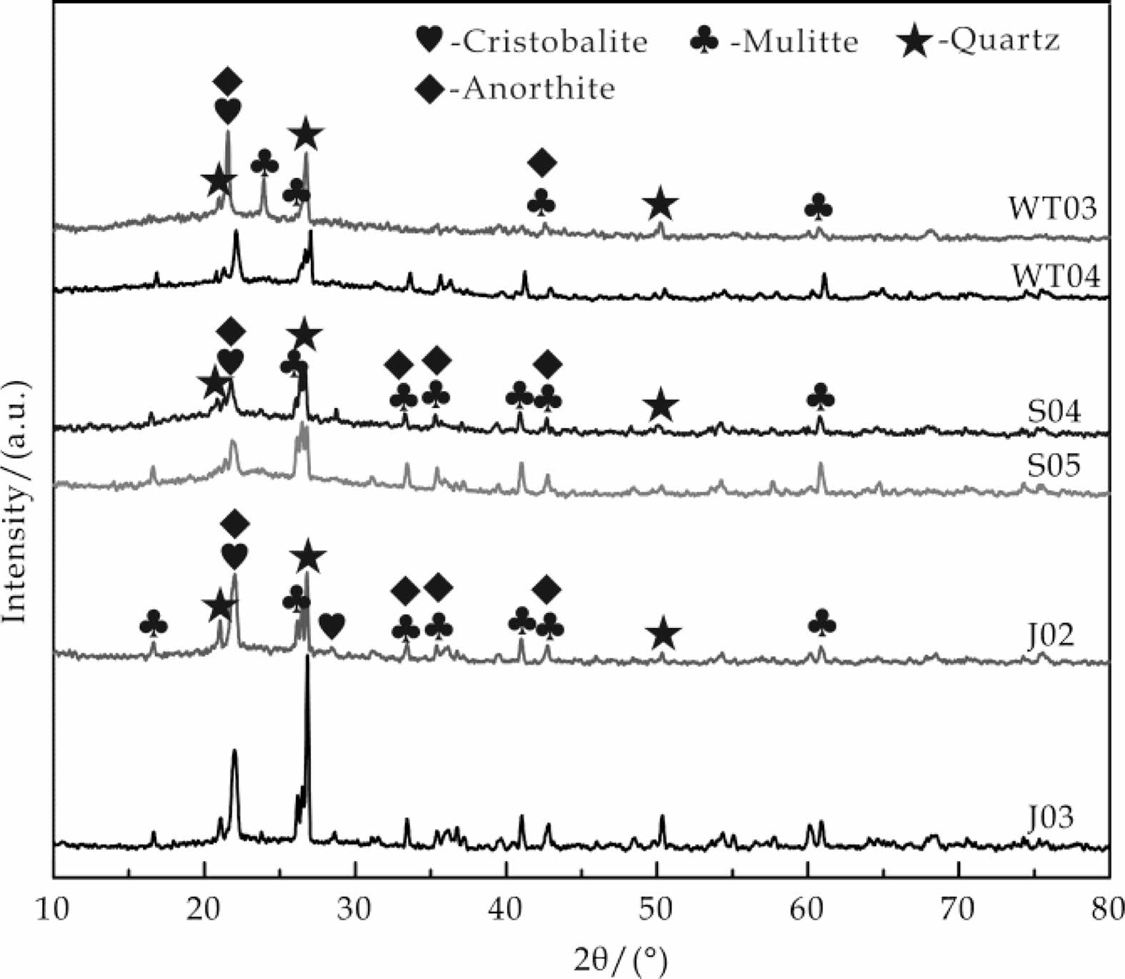 Fig. 4 shows the XRD patterns of WT03, WT04, S04, S05, J02, and J03 glazes. The characteristics of the amorphous hump can be seen within the 2θ≈15-35°range in all samples, which are associated with a large amount of aluminosilicate glass [18], where S05 and WT03 are the most obvious. In addition, all samples have different intensities of crystalline diffraction peaks, where the most intensive is from the Jin dynasty, followed by the Five Dynasty, and the weakest is in the Song dynasty. The anorthite content of the celadon glazes of the three dynasties is high, which is related to the content of CaO in the glaze (as shown in Table 3) .The content of CaO in the glaze of the three periods is strong relatively, which has a greater contribution to the precipitation of anorthite crystals and makes the content of anorthite crystals increased. This is because the chemical composition of the ceramic glaze determines its crystallinity [19].The compositions of the base glaze from the three dynasties are relatively close to each other, and the crystal types are basically the same. Among the three samples, the crystalline content in Jin dynasty sample was relatively high, likely due to its firing temperature.
