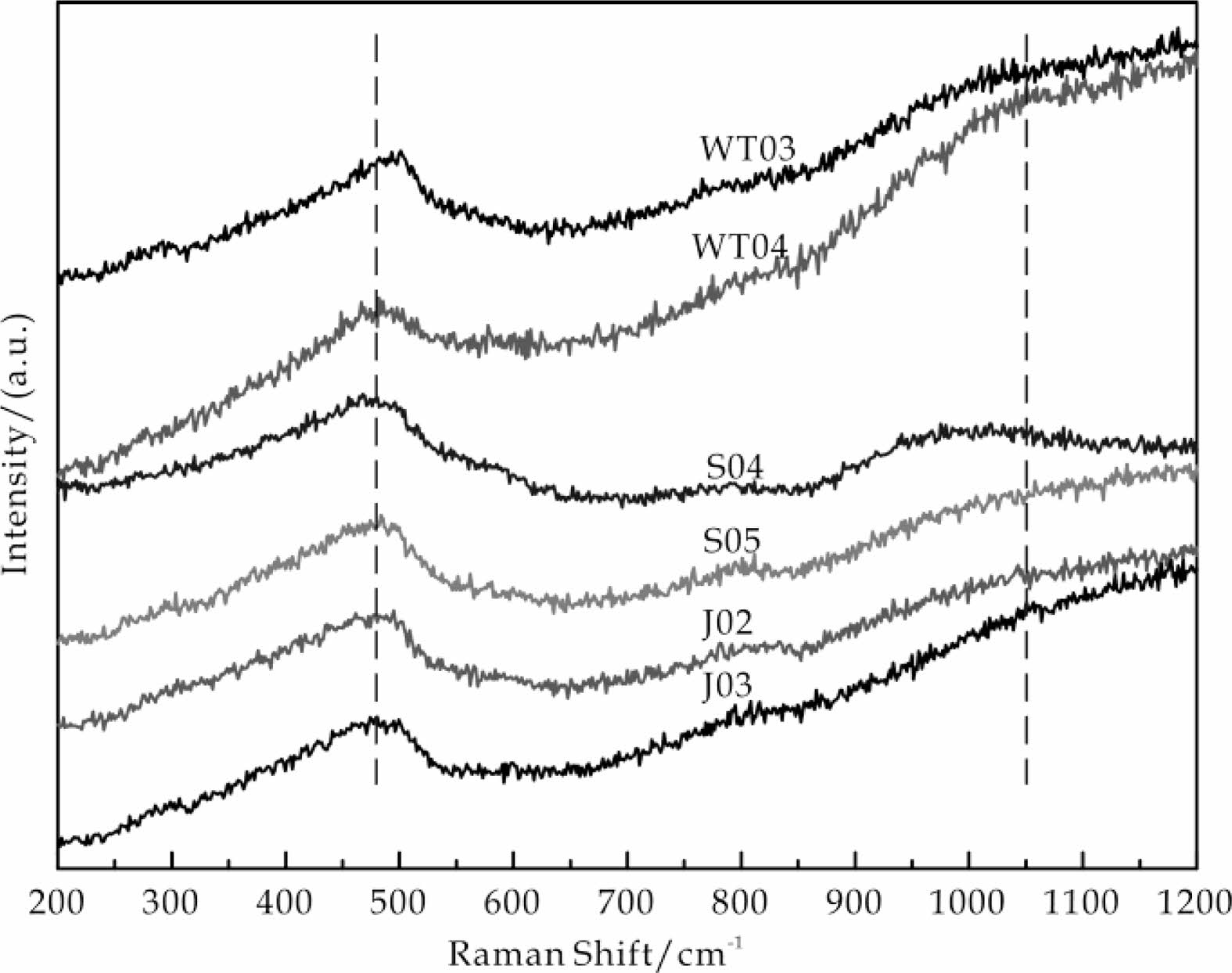 Figure 5 shows the Raman spectrum of the glaze of WT03, WT04, S04, S05, J02, and J03 samples. It can be seen that all samples have two strong Raman peaks at 480.53 cm-1 and 1050.62 cm-1, which are the bending and stretching vibration peaks of the Si-O bond in the [SiO4] tetrahedron [20, 21]. According to the research of Colomban et al. [20], the bending vibration peak and stretching vibration peak of the Si-O bond in the sample [SiO4] tetrahedron were Gaussian fitted, and their respective Ip values were calculated (as shown in Fig. 6). The order of their Ip values is S05 > S04 > WT03 > WT04 > J03 > J02. Accordingly, the firing temperature of the Song dynasty olive-green glaze of the Yaozhou kiln is the highest, followed by the Five Dynasty sky-green glaze, and the Jin dynasty moon-white glaze is the lowest. This is consistent with the results of previous studies [13, 22].
