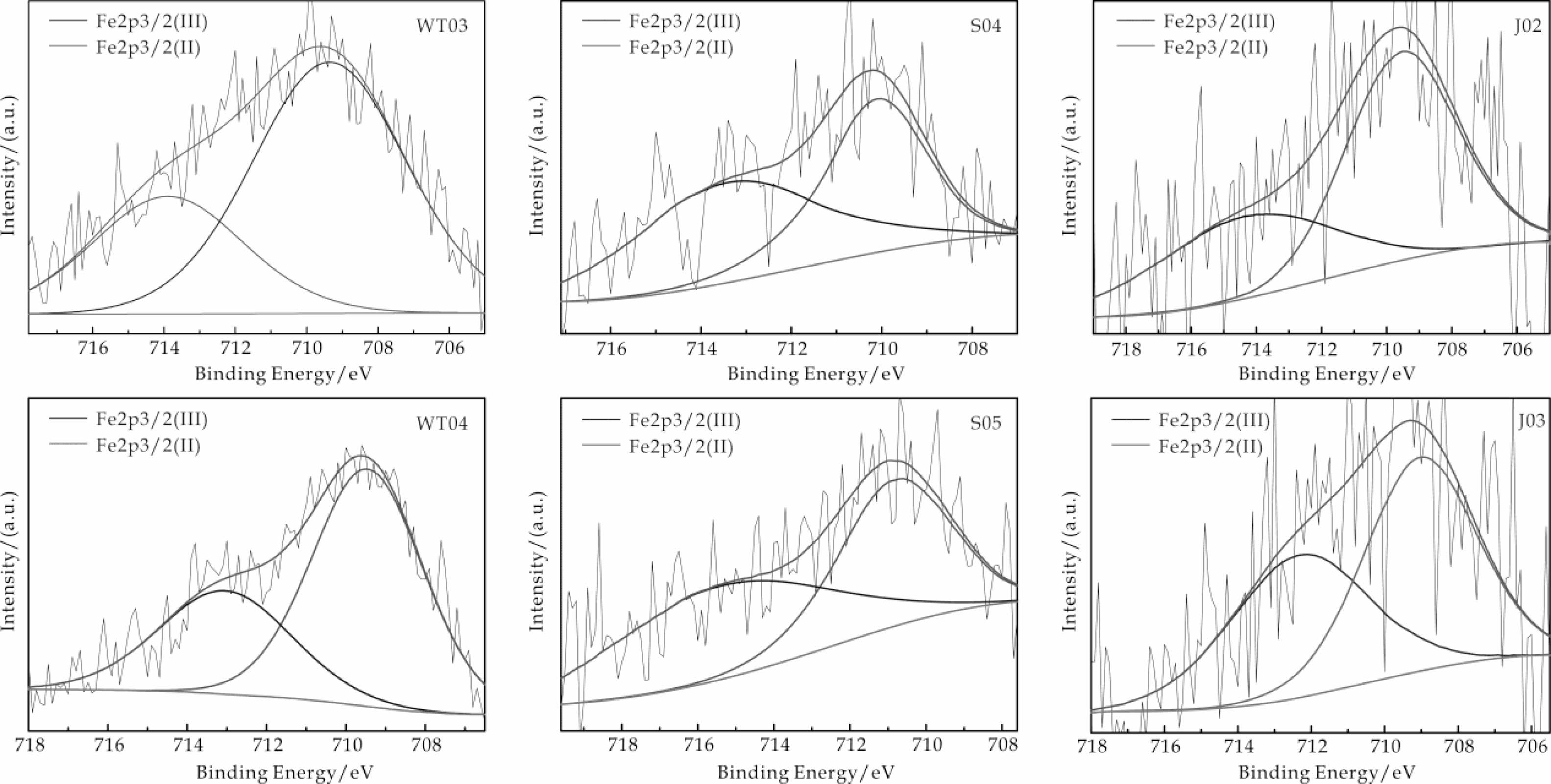 The color of celadon glaze is mainly determined by the chemical color produced by the Fe ion coloring group. To accurately analyze the relationships between the coloration and the chemical state of the Fe element of the Yaozhou Five Dynasty sky-green, the Song dynasty olive-green and the Jin dynasty moon-white glazes, two samples close to the average value of each dynasty were selected according to the L*, a*, and b* values by Casa XPS software to perform peak-split fitting processing on its Fe 2p3/2 energy spectrum curve. It was found from the fitting diagram in Figure 8 that the electron binding energies of Fe2p3/2 (III) and Fe2p3/2 (II) are 712.02-714.83 eV and 708.44-710.78 eV, respectively [20]. According to the area of each peak, the ratios of Fe3+and Fe2+ in samples WT03, WT04, S04, S05, J02, and J03 are 31.55/68.45, 34.15/65.85, 55.22/44.78, 51.51/48.49, 39.03/60.97, and 44.94/55.06, which is consistent with the results of the UV-vis-NIR reflection spectra in Figure 9. Generally, the sample color of the Five Dynasty sky-green glaze is relatively blue, the Song dynasty olive green glaze is yellowish green, and the Jin dynasty moon-white glaze is between the two but closer to that of the Five Dynasty. The greater the ratio of Fe3+ to Fe2+, the greater the b* value of the glaze [24], which is generally consistent with the b* values of the samples in Table 2.