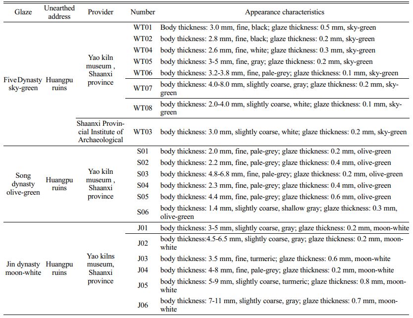 The Five Dynasty, Song, and Jin dynasty celadon shards of Yaozhou kiln were adopted as test samples. The unearthed addresses, providers, and external characteristics of the samples are listed in Table 1. The digital photos of some samples are shown in Fig. 1.
