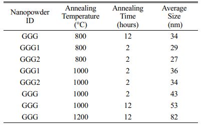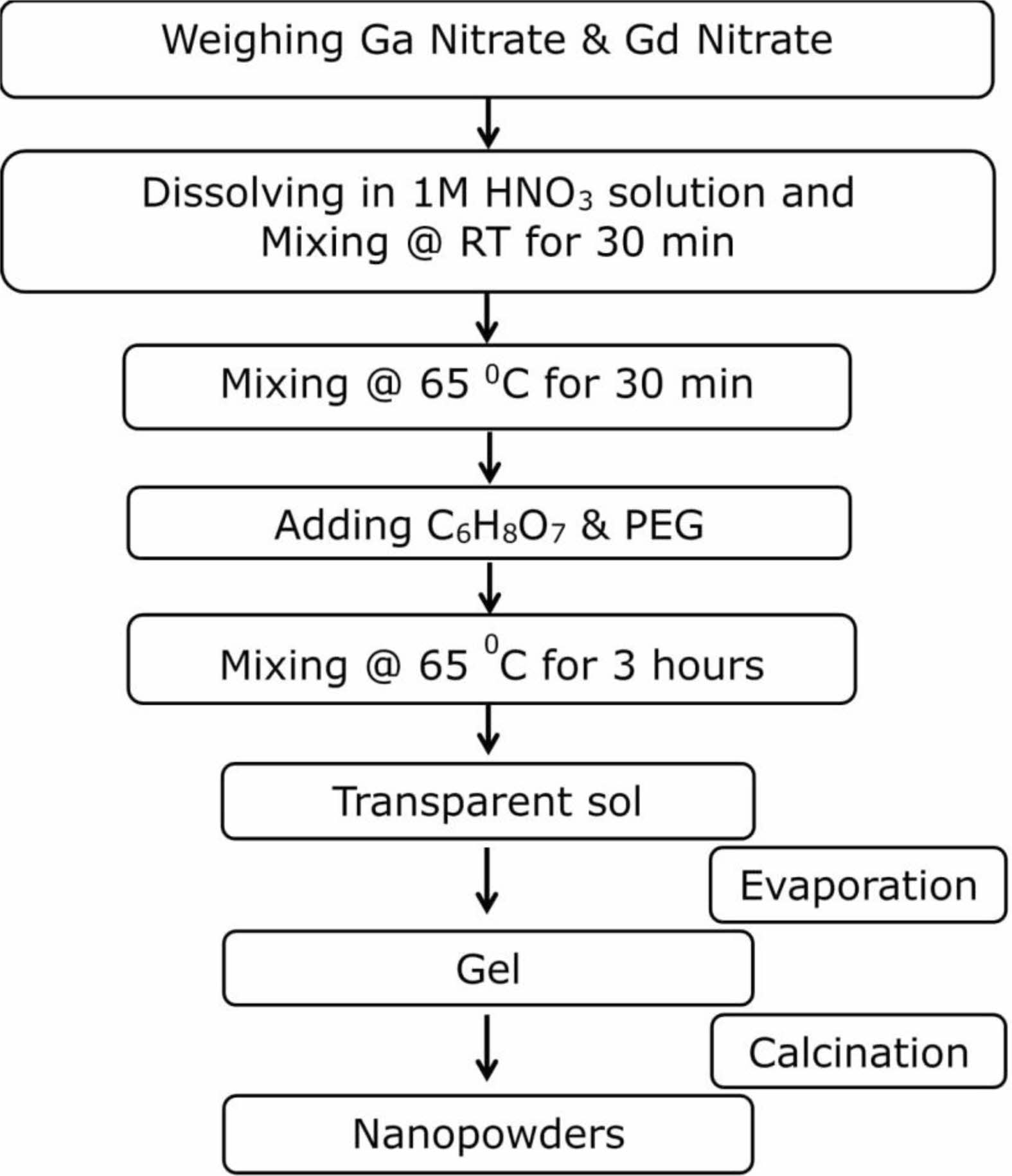 Gadolinium-gallium garnet nanopowders were synthesized using the sol-gel pechini method in an air atmosphere. Chemicals were all analytical grades and purchased from Sigma-Aldrich. Double-distilled water was used to synthesize the solutions. Stoichiometric amounts of high-purity Ga(NO3)3xH2O (Aldrich, 99.99 %) and Gd(NO3)3x6H2O (Aldrich, 99.99%) reagents were dissolved in 25 mL of a 1 M aqueous stirring solution of nitric acid (HNO3). After mixing for 30 minutes adequately, the solution was heated to 65 °C under stirring using a magnetic agitator for another 30 minutes. A suitable amount of citric acid (4.2 g) was mixed as a chelating agent to the above solution. The citric acid ratio of the total mole number of the solution was 0.02 mol% (mol/L). Then, 12.6 g polyethylene-glycol was used as a cross-linking agent, corresponding to three times the mass amount of citric acid. PEG density was dPEG=1.204 g/mL. The obtained solution was continuously stirred at 65 °C for three hours until the highly transparent sol became gel by slow evaporation. After aging for ten days at room temperature, the gel was annealed in a ceramic furnace, altering temperatures from 500 to 1200 °C at 7 °C/min-1 heating rate without an intermediate annealing step and held at each temperature for different hours in the air. The resulting powders were lightly crushed in an agate mortar to the fine powder for two minutes. The detailed process for preparing and annealing gadolinium-gallium garnet nanopowders by the sol-gel method is illustrated in Fig. 1.