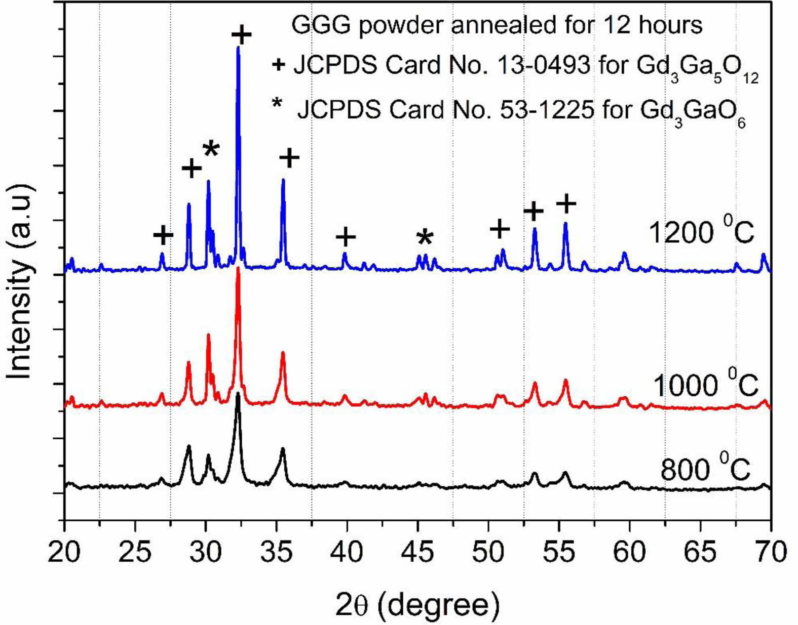GGG, GGG1, and GGG2 nanopowders were synthesized to investigate the effect of molar ratio on the crystal structure of gadolinium-gallium garnet nanopowders to eliminate the second phase. X-ray diffraction patterns as a function of annealing temperature indicate that all samples are amorphous up to 700 °C. The pictures of GGG, GGG1, and GGG2 powders annealed from 500 to 1200 °C are illustrated in Fig. 4.