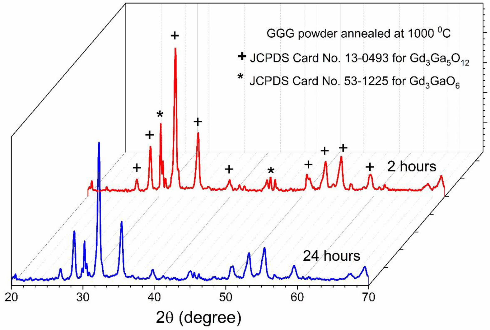 Fig. 3 XRD patterns of GGG sample annealed at 1000 °C for 2 and 24 hours. |