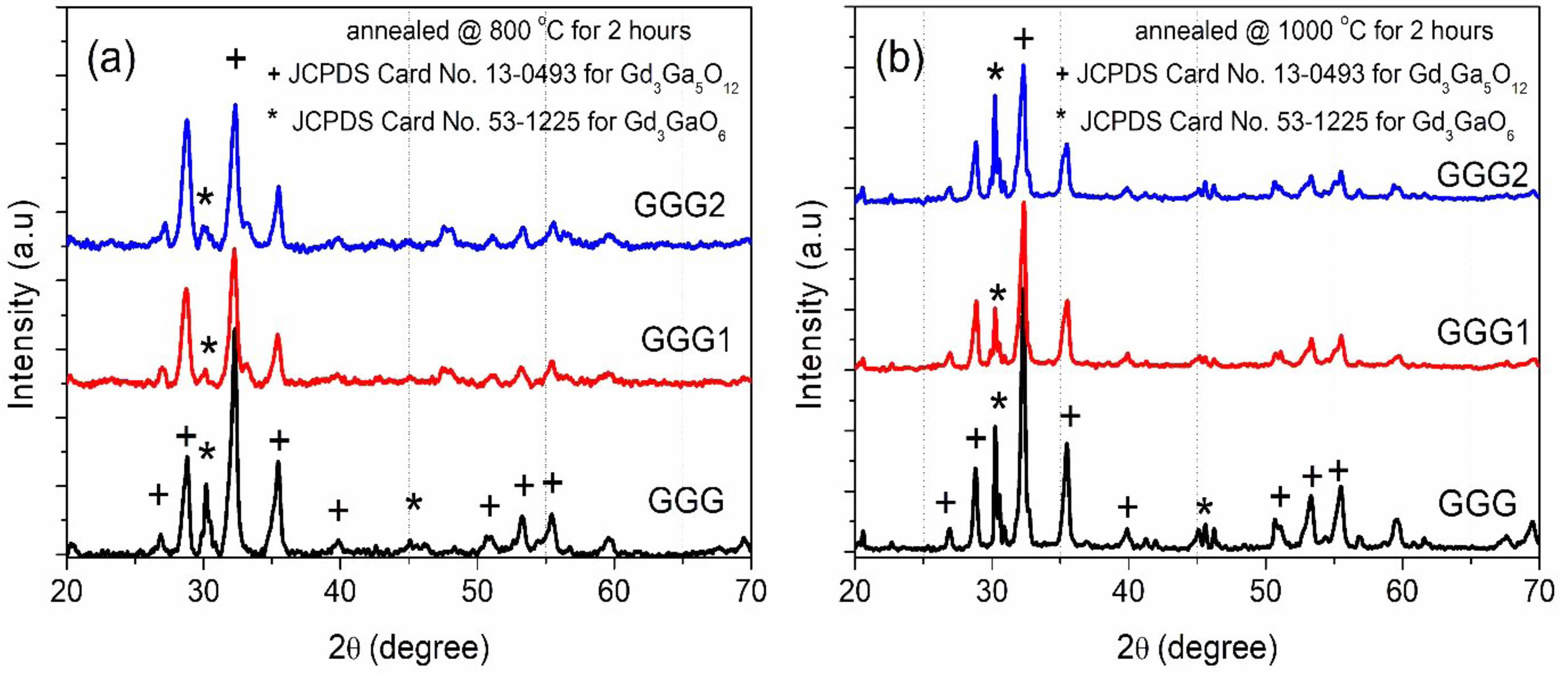 Fig. 5 XRD patterns of GGG, GGG1, and GGG2 samples annealed at (a) 800 °C and (b) 1000 ºC for 2 hours |