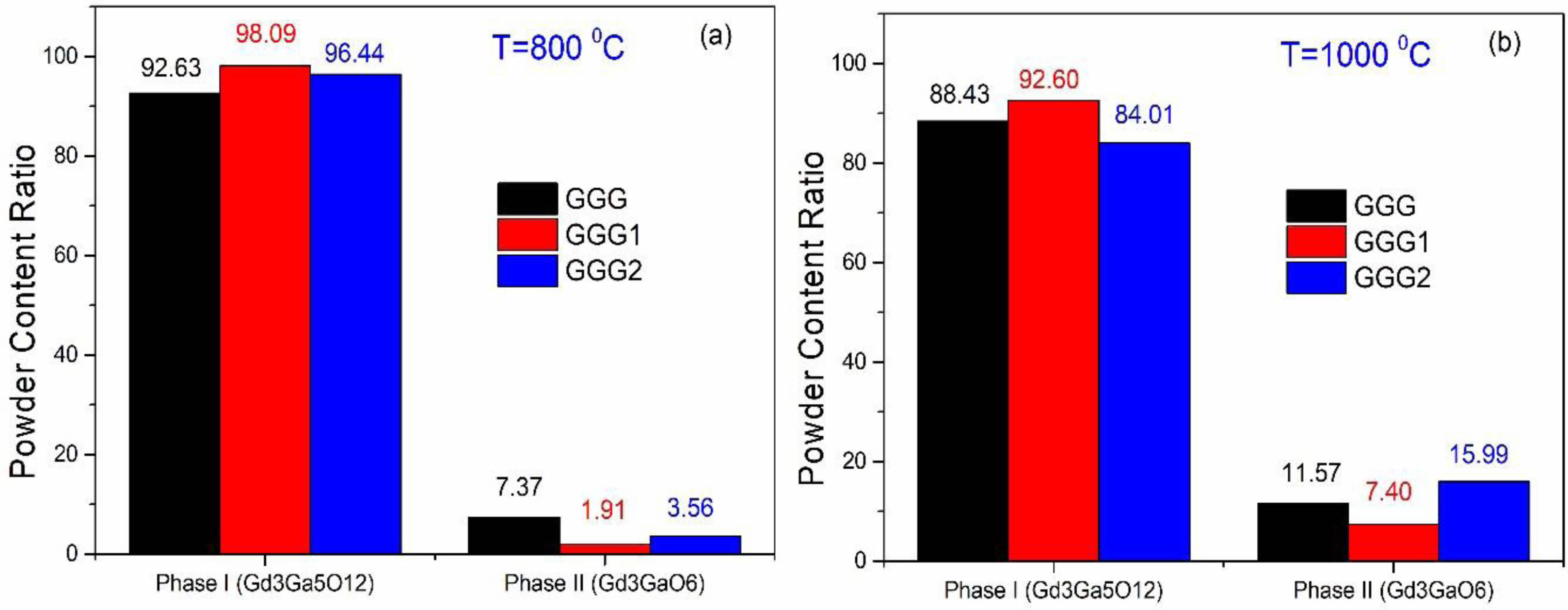 Fig. 6 The content ratio of the two phases for GGG, GGG1, and GGG2 nanopowders at 800 °C (a) 1000 °C (b) for 2 hours. |