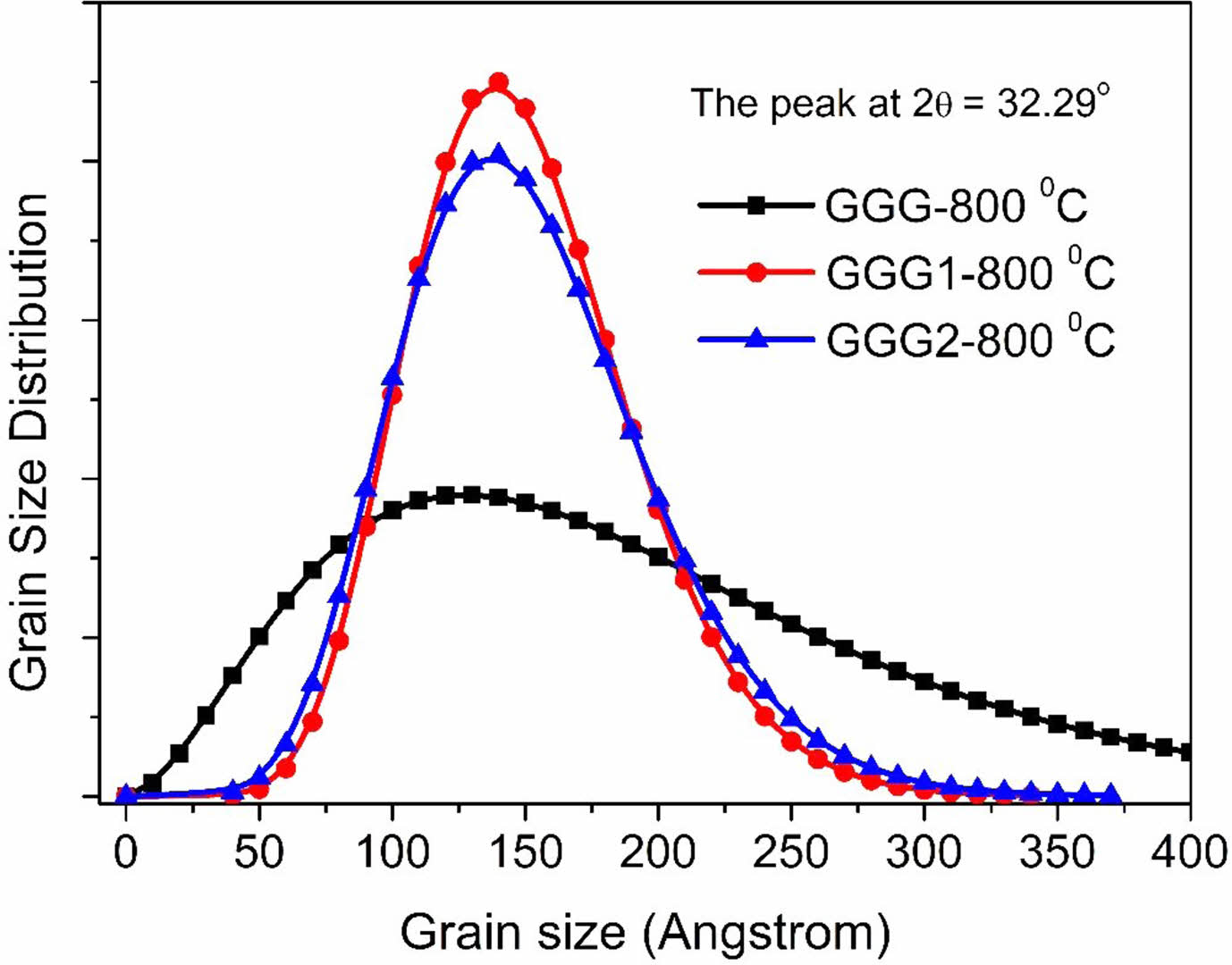 The grain size distribution of the nanopowder samples annealed at 800 °C versus the grain size is shown in Fig. 7. GGG1 and GGG2 samples have similar particle size distributions. The results are compatible with the mean particle sizes of the nanopowders calculated from the Scherrer equation.