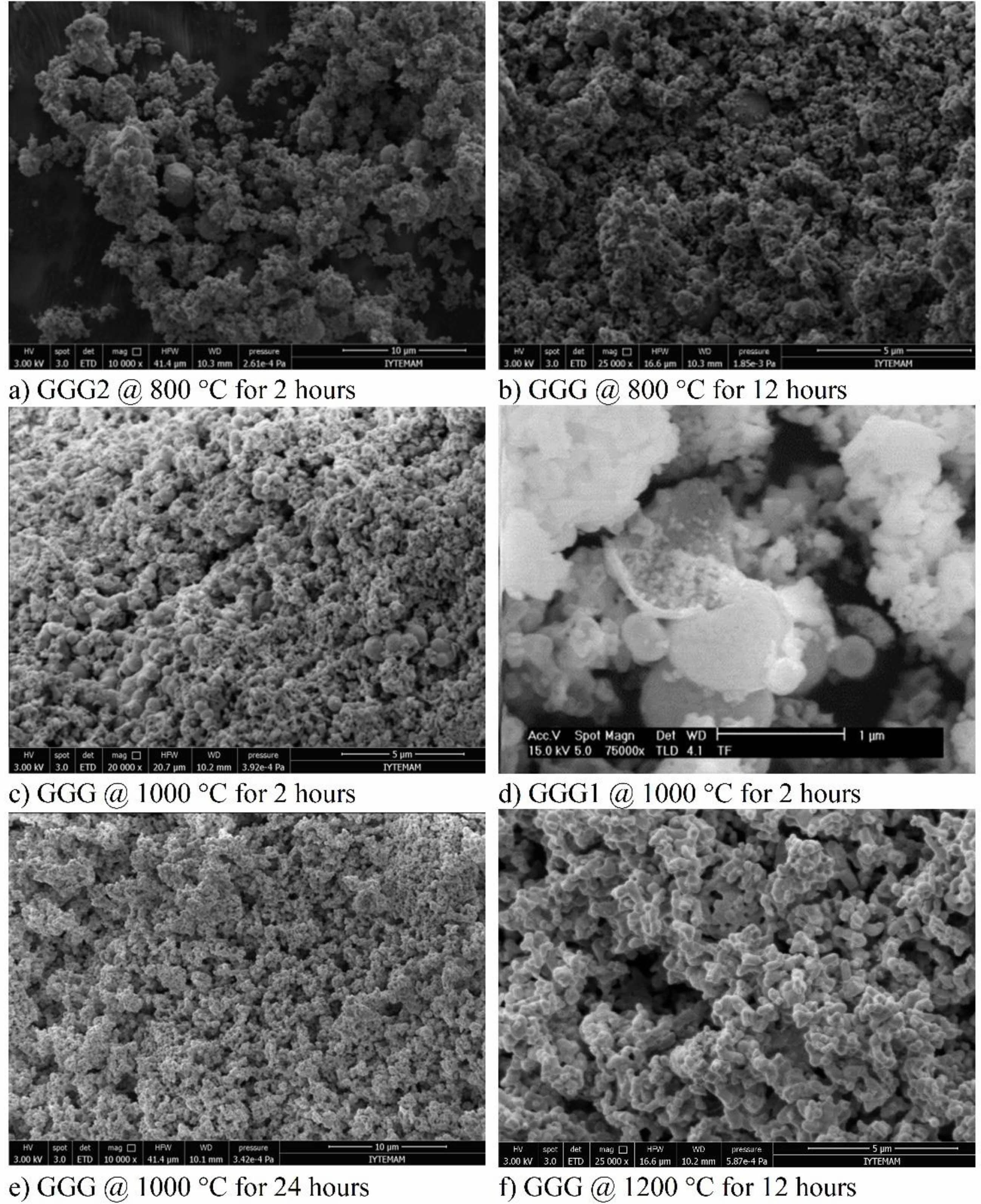 SEM images of the synthesized powders are shown in Fig. 8. It can be observed that all powders are loosely agglomerated, and there are spherical nanoparticles in the structure annealed at 800 °C for two hours with the particle diameter ranging from 400-500 nm (Fig. 8(a)). When the annealing duration time is increased from 2 hours to 12 hours, both the structure and the nanoparticles contain many pores (Fig. 8(b)). Although the nanobubbles maintain good spherical shapes in GGG and GGG1, their diameters decrease slightly at 1000 °C (Fig. 8(c), 8(d)). Fig. 8(d) shows the SEM image of one of the cracked nanobubbles in the structure of GGG1 nanopowders annealed at 1000 oC for 2 hours. It can be seen from the picture that the nanoparticles are made of thin spherical shells with larger particle sizes. The increased annealing duration from 2 hours to 24 hours shows that the structure contains a few nanobubbles and lots of pores. At higher temperatures, the nanoparticles split into smaller particles, and then they start to agglomerate into a network (Fig. 8(f)). SEM images of the GGG powders annealed at 1200 °C for 12 hours present similar ellipsoid shapes with a smaller particle size distribution. It can be summarized that, as the temperature increases, the diameter and number of the nanobubbles decrease, the particle size becomes gradually greater, the morphologies of crystallites convert from sphere to ellipsoid, and neck connections can be observed to form aggregations.