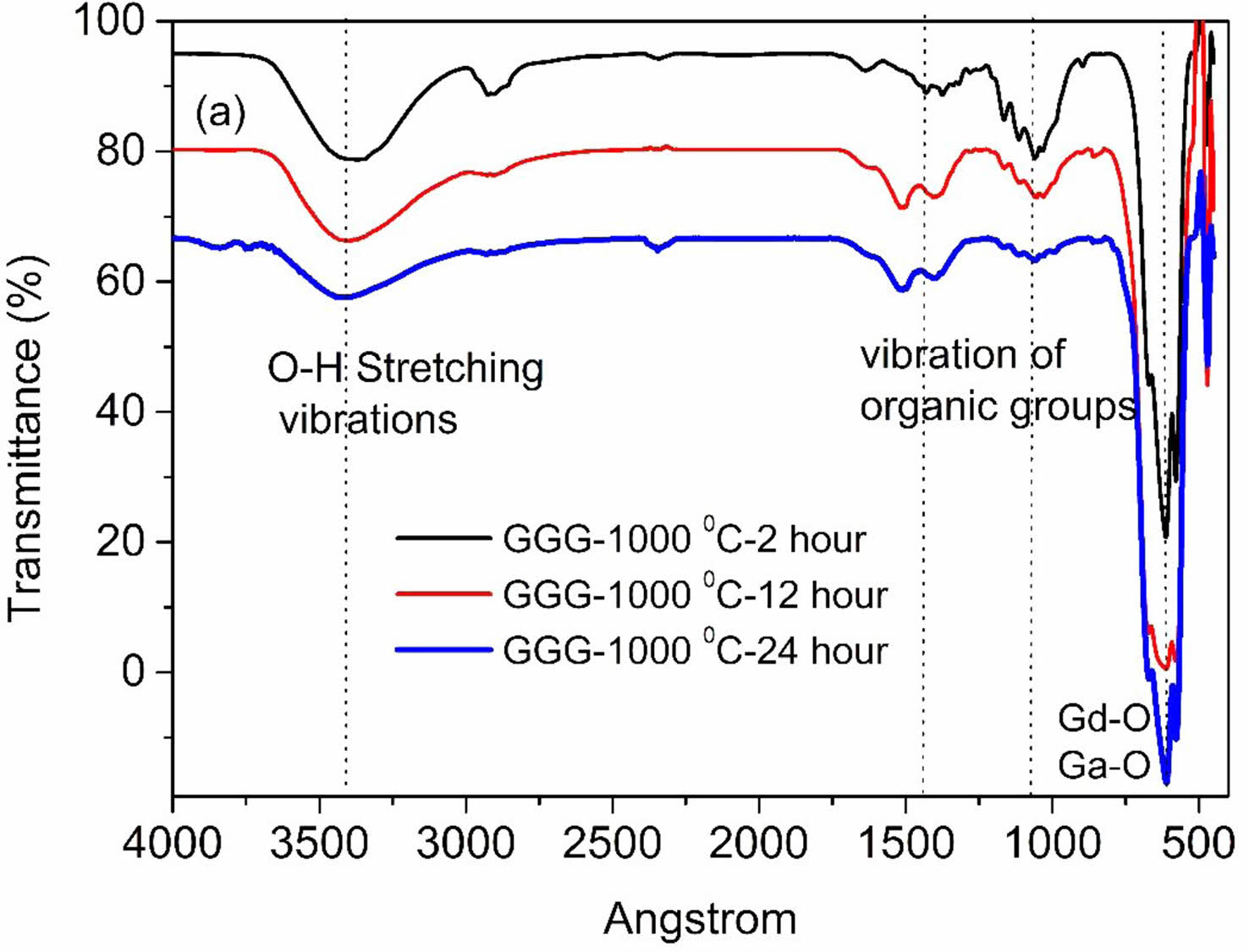 FT-IR spectroscopy was recorded as another method to support the characterization of samples. The FT-IR spectra of GGG annealed at 1000 °C for different hours are illustrated in Fig. 10. The FT-IR spectra present intense broad absorption bands in the ranges of 3600-3000 cm-1 arising from stretching vibrations of the hydroxyl group. The other peaks at around 1507, 1390, and 1074 cm-1 can be ascribed to N-H, N-O, and C-O bond vibrations, respectively [23]. The increasing calcination temperature weakens all these absorption peaks due to the decomposition of starting materials. The characteristic Gd-O and Ga-O metal-oxygen stretching vibration peaks representing gadolinium-gallium garnet formation are observed at 673, 616, and 571 cm-1 after 800 °C annealing temperature and 2 hours of annealing holding time [12]. The absorption intensity of Gd-O and Ga-O bands became stronger with the increasing annealing time and temperature due to the growth of crystallinity. The results are in good agreement with XRD measurements.