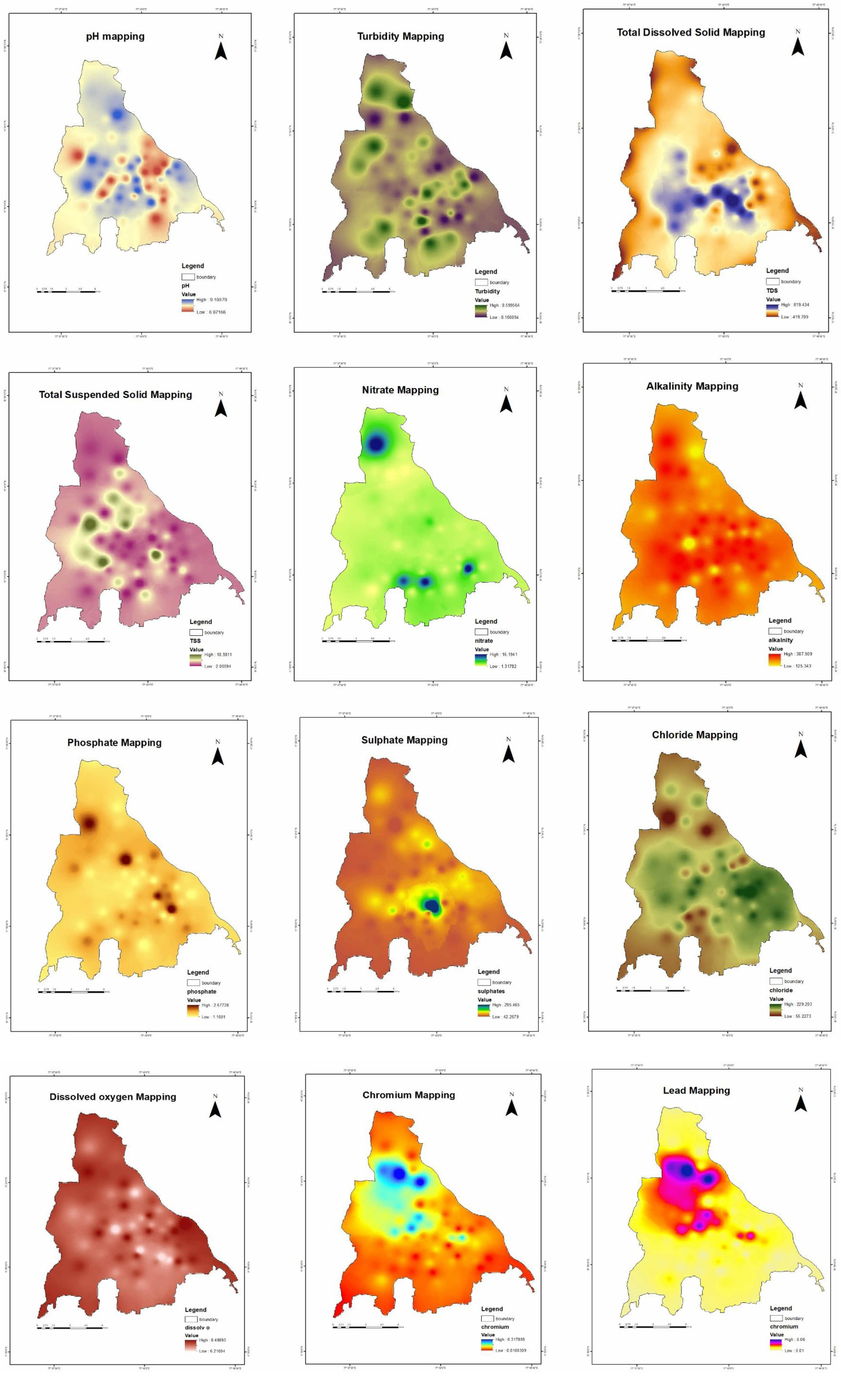 For mapping, editing, analysis, and data management in ArcGIS for Desktop, ArcMap has been the main tool. The Inverse Distance Weighted (IDW) approach was carried out with ArcGIS 10.3 in the Spatial Analyst Extension. The experimental results from the laboratory study of water samples collected from 60 locations inside Erode municipal limits were combined into an excel file, then translated into a shapefile. The overage of the data obtained for each parameter from the measured sites was employed in the computation of each interpolated cell. On the output raster, the cells corresponding to the Erode City region got the values of the first input raster. Water quality ratings were based on pollutant geographic distribution with a map legend based on each parameter's data range.