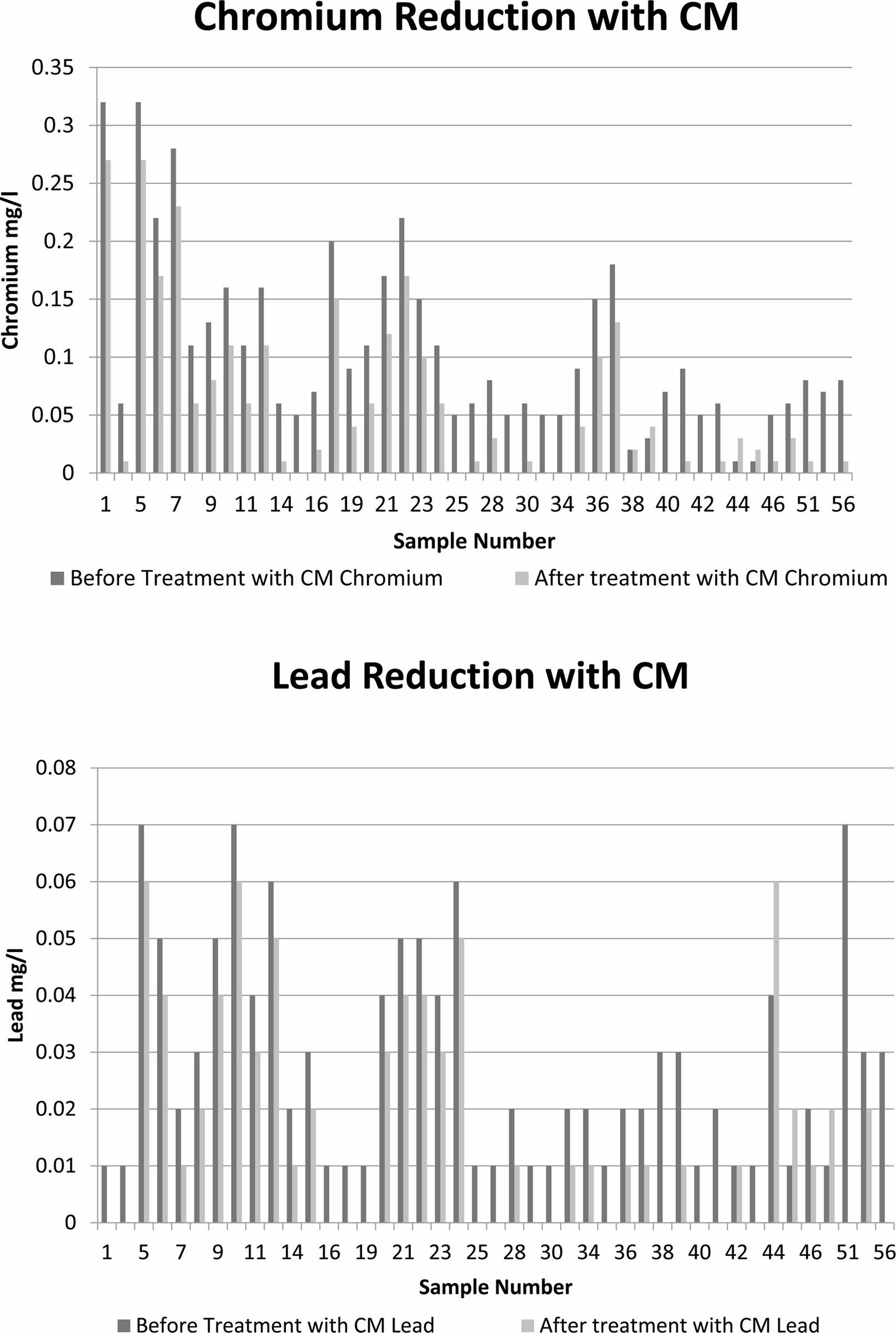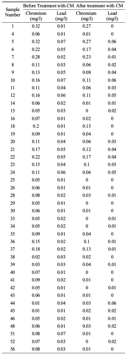 The reduction levels of heavy metal chromium and lead are done with CM. The Sample having greater than the permissible limits are chosen and their reduction is compared with the other through bar graph 1.