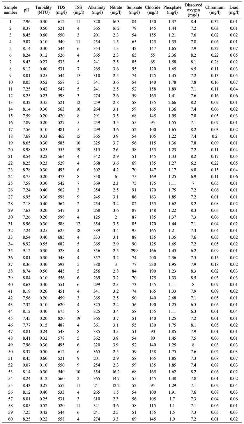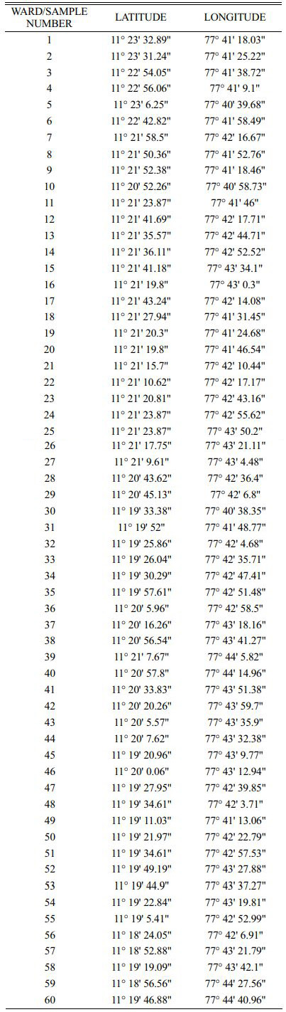 The water samples are collected from the underground water. Sixty water samples (60) are collected in Erode City. Each water sample is collected in each ward in Erode city. The sampling location are located in Fig. 2 and the location i.e., latitude and longitudinal values are mentioned in the Table 1.