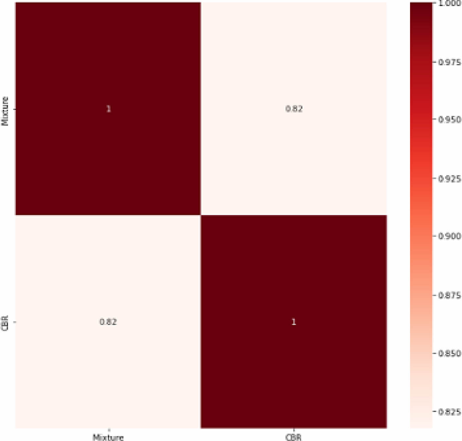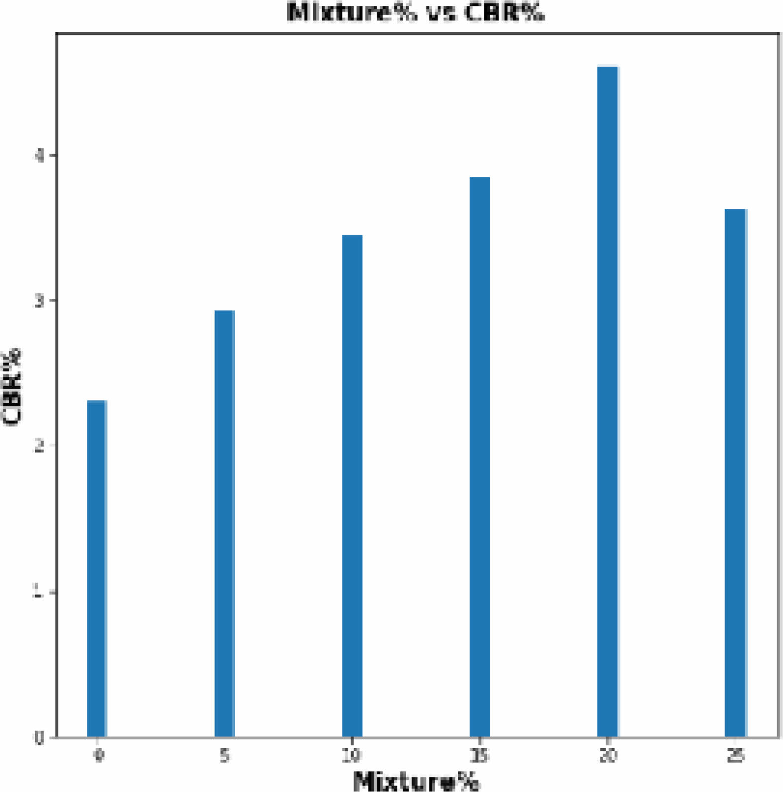 From the above CBR vs. Soil Mixture, it can be said that there is a proportional relationship between CBR and mixture. The CBR values are increasing with the increase of mixture to some extent. The correction is calculated like Mixture-Mixture = 1, CBR-CBR = 0.82, and Mixture-CBR will be calculated using different algorithms. Therefore, it can be observed that there is comparatively good relationship between CBR and Mixture for the expanded soil.