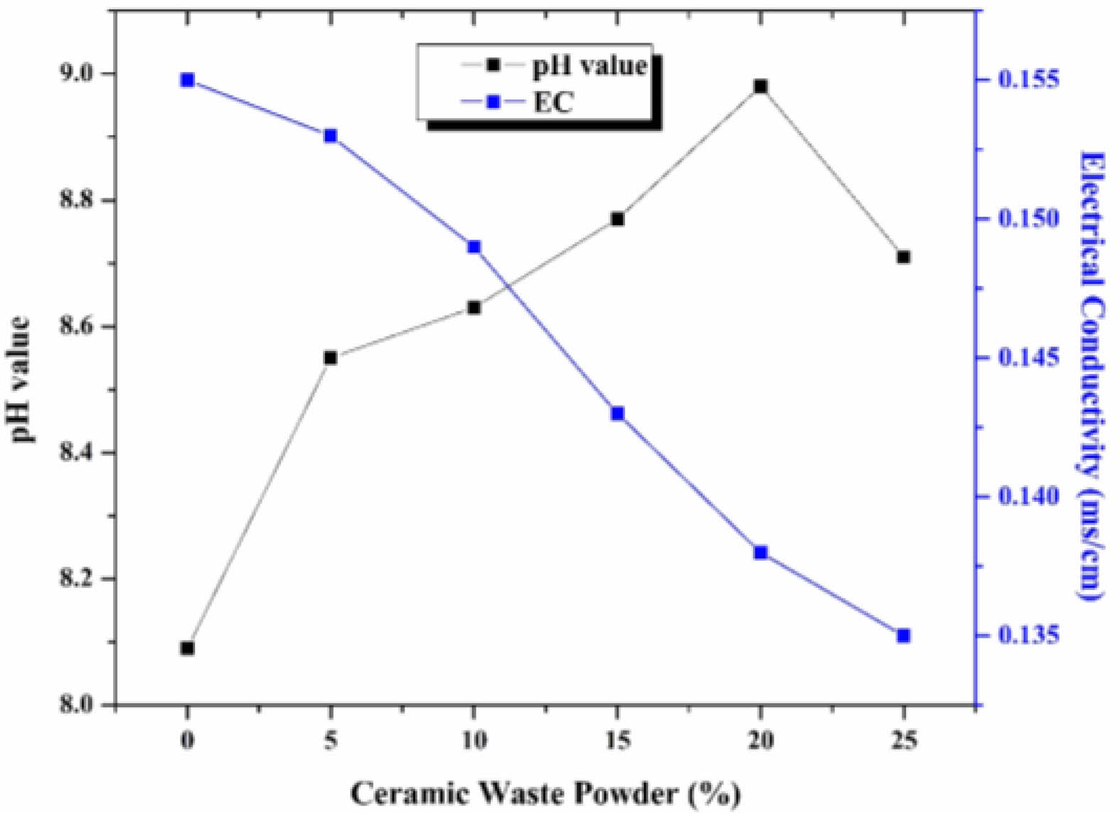 (2) Electrical conductivity decreased with respect to an increase in the CWP content of the soil. The reduction was due to an increase in the bulk density of the clay soil. The bulk density of the CWP was higher compared to the Expansive soil.