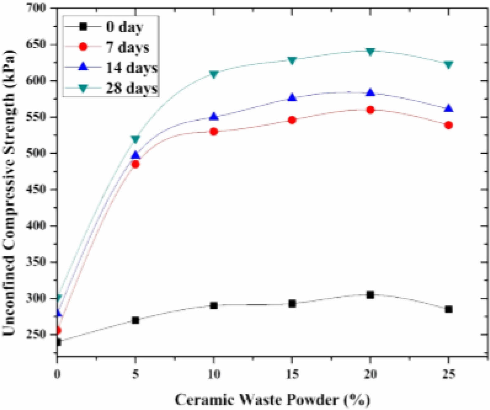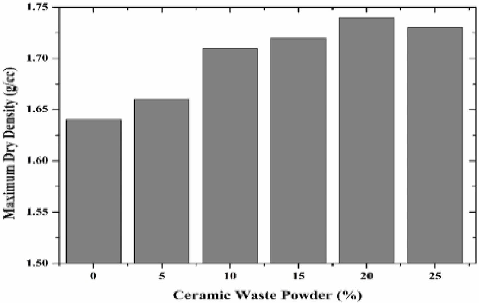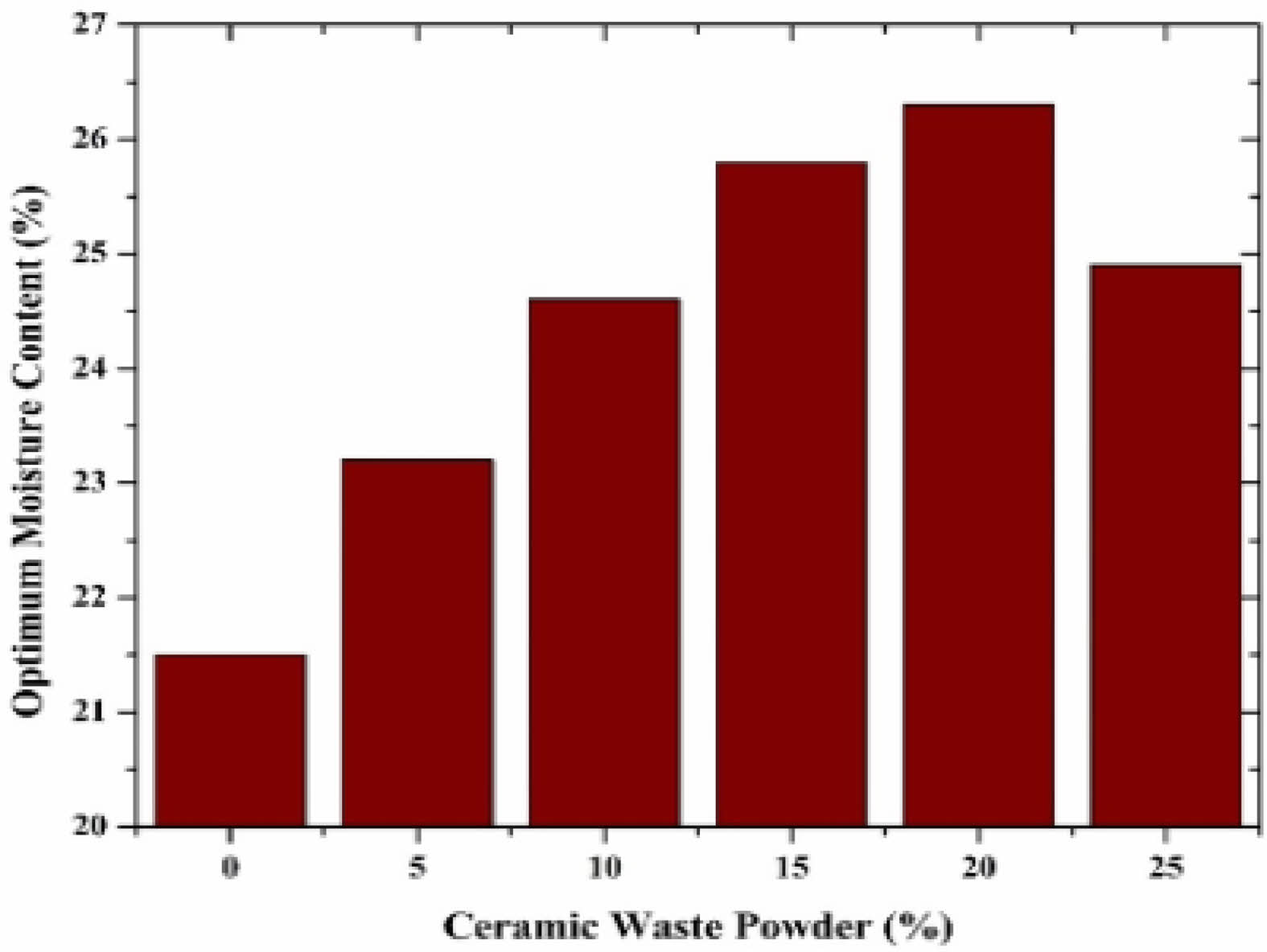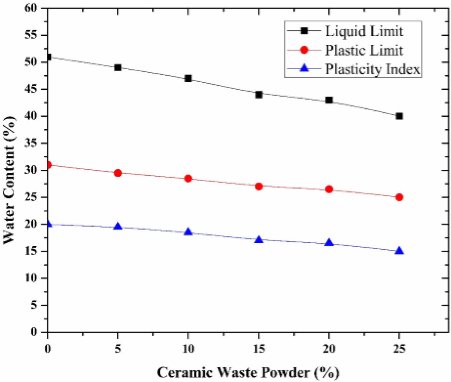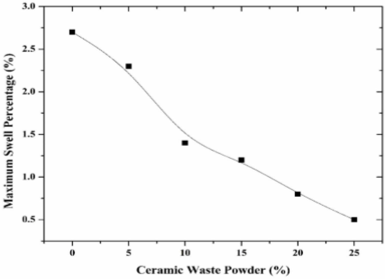 Quarry Dust [2], marble dust [16], baryte powder [16], pyroclastic dust [16], and brick powder [16] are some of the prominent dust/powders like waste materials that successfully utilized for the stabilization of expansive soil. It is generally acknowledged that ceramics do have great endurance for accepting various components because of the heterogeneous nature of natural ceramic raw materials. However, using waste in construction projects has a significant potential [26]. The CWP can be utilized to stabilize the expansive soil. On account of the unavailability of good quality construction material within the desired location, the cost eventually rises [17]. The waste from ceramics is both harmful and hefty [25]. About 32% of the everyday production in industries is neglected as a waste of which about 40% is occupied by ceramic waste. The problematic factors such as intrinsic swell–shrink behavior, settlements, shear strength, and permeability in expansive soil can be solved with the inclusion of CWP. CWP helps in improving soil strength and controlling swell potential. The prevention of disposal of harmful substances to the environment, the protection of biodiversity all over the world, increment in strength and other engineering properties of soil, and permeability reduction and penetration are the added advantages of utilizing industrial wastes in an efficient way [17]. It was observed that the stability period increased with an increase in CWP in soil [20]. Minimizing environmental contamination is greatly beneficial by using discarded marble dust as a sustainable material for subgrade stabilization [24].
