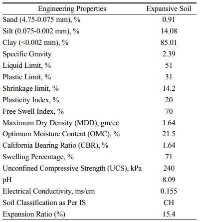Soil plays a vital role in the environment as it is also responsible for life on earth. It is formed from the disintegration of the major types of rocks, viz., Igneous, Metamorphic and Sedimentary Rocks. Hence, the disintegrated parts have different engineering, physical and chemical characteristics [3]. Soil is typically a non-homogeneous, porous, earthen material whose engineering behavior is influenced by alteration in moisture content and density. In the geotechnical fields, clay is considered a problematic soil that needs modifications for better construction applications. Expansive soil, a high clayey soil, is highly compressible and possesses low shear strength. It is found in almost any parts of Maharashtra, Gujarat, Madhya Pradesh, Andhra Pradesh, and a few parts of Tamil Nadu. It occupies almost 18% of the total area of India. Predominantly, it is found deep on the top banks of rivers Godavari and Krishna. The sensitivity is greater in the case of changes in moisture content [15]. Construction on this type of soil is difficult because of its instability and volume change. Owing to the capillary action in soils, the water permeates into the top surface and bottom layers [14].