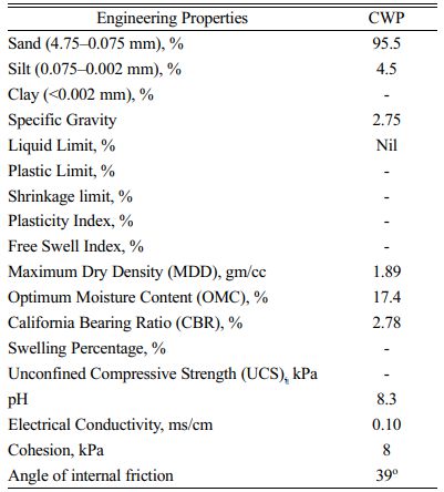 (8) From the particle size analysis, it was observed that the plasticity index of the soil decreased from 20% to 15%. This reduction was due to the replacement of plastic particles of the expansive soil to non–plastic CWP particles accordingly.