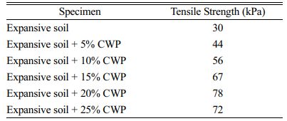 The influence of CWP on the tensile strength of expansive soil was shown in Table 4. As observed from the table, the tensile strength value calculated from the splitting tensile test after 30 days of curing was shown in Table 3 with respect to the inclusion of CWP at 0%, 5%, 10%, 15%, 20%, and 25%.