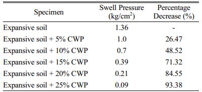 Table 5 Swell pressure observed for the specimens with varying CWP percentages. |