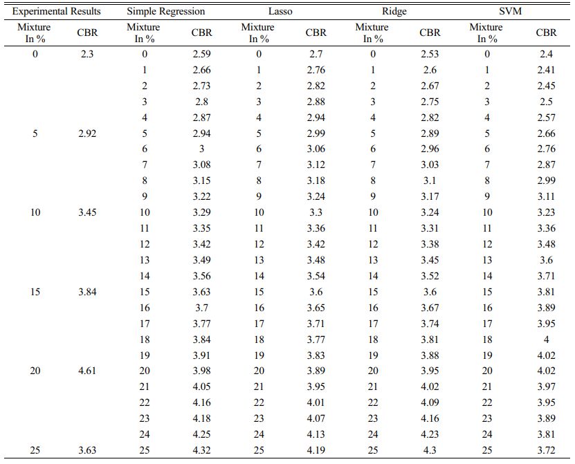 Different experiments on expanding soil- Ceramic Waste Powder samples/mixes were used to create data for the creation of Simple Regression Algorithm, Lasso Algorithm, Ridge Algorithm, and SVM Algorithm models. Various regression approaches were used to create soil - Ceramic Waste Powder samples for the suggested models. The soil was combined with Ceramic Waste Powder from 0% to 25% in 5% increments, and Ceramic Waste Powder was added to the soil from 0% to 5% in 1% increments. CBR tests were performed on samples that were produced within their respective ranges.