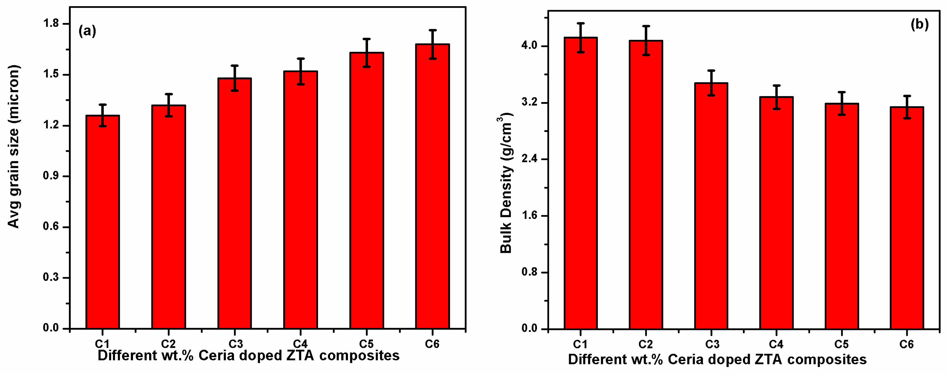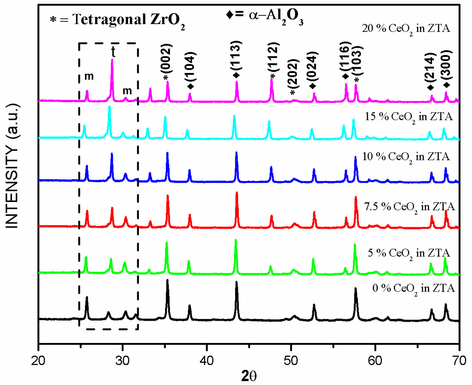 From XRD analysis a continuous increment in peak intensity for tetragonal phase of zirconia is observed with increasing amount of ceria inside ZTA. The adverse effect is observed on monoclinic phases. The evaluated value of t-ZrO2 and m-ZrO2 also support similar finding. The increasing trend of tetragonal phases is also replicated on the crystal size, which is monotonically increasing with increasing percentage of ceria in ZTA. The results are in-line with earlier investigation of Sato and Shimada [27] and Tsukuma [28]. Researchers noticed that the improvement in retention of metastable tetragonal phases at room temperature is attributed to presence of ceria particles. Hence, from finding it can be concluded that the ceria particles significantly enhance the percentage of tetragonal phases inside the cluster of ZTA matrix.