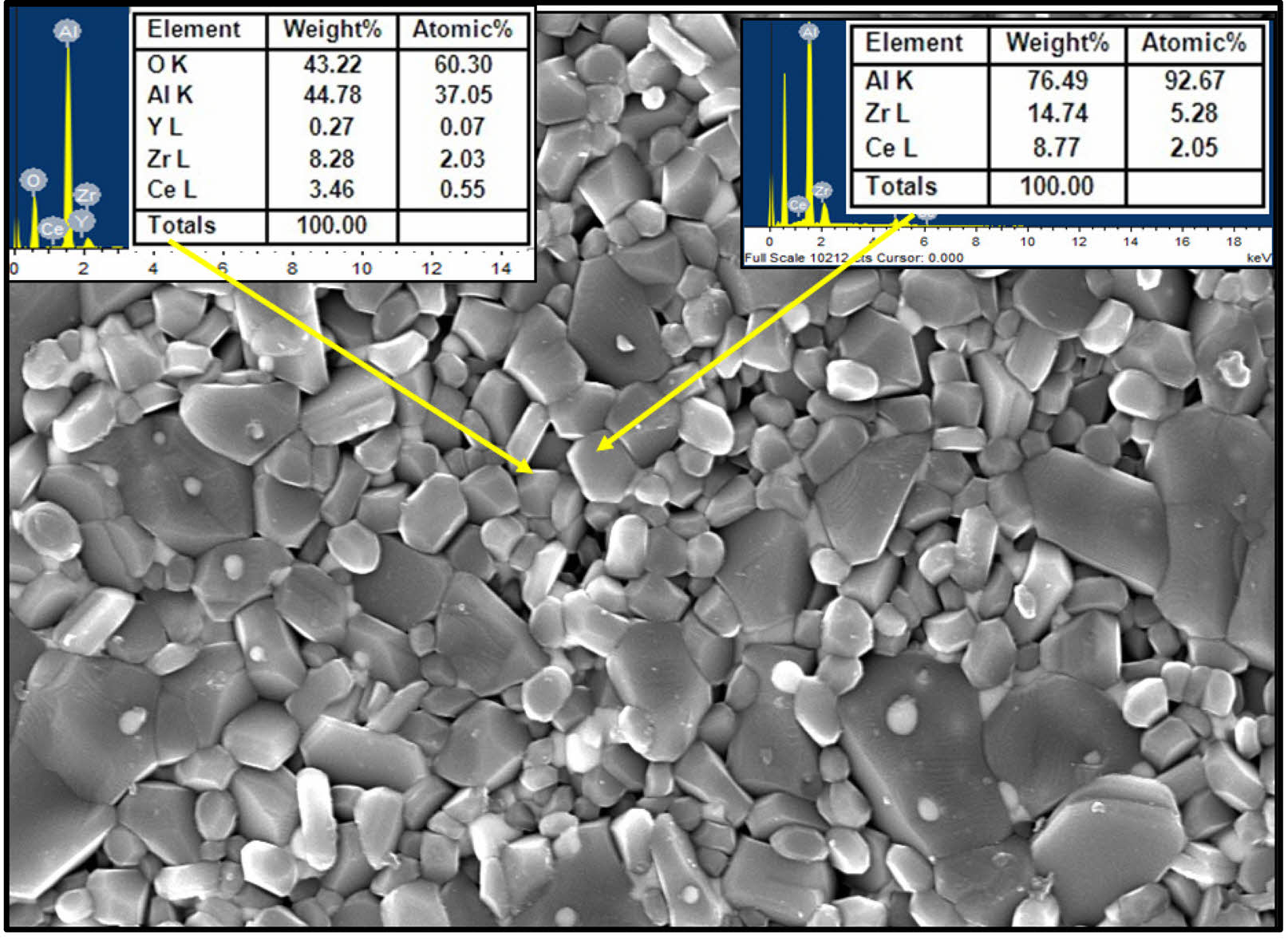 The structural analysis for all developed composites is carried out through FESEM images, maintaining same magnification during capturing the images. The FESEM images of all composites are shown in Fig. 3. Well dispersed ceria grains inside the cluster of ZTA with high homogeneous structure is observed for all the composites with EDS is shown in Fig. 4. The EDX analysis shown in Fig. 4 suggests that the ceria particle possess a plate like structure. The observation from all FESEM images suggests that the grain sizes of ceria increase with increasing weight percentage of ceria inside the ZTA cluster. The similar observation is also noticed through grain size measurement using particle size analyser i.e. grain sizes of composites increases with increasing percentage of ceria inside the cluster same is shown in Fig. 5(a). From Fig. 5(a) an increment from 1.26 micron to 1.68 micron is observed, corresponding to the presence of ceria molecules that supports the fusion of grains inside the cluster. Similar kind of observation was earlier reported by Tsukuma and Shimada [29]. Researchers noticed that the presence of CeO2 formed a pyrochlore type compound that break the lattice constants of the tetragonal phases. The lattice constrain breakdown creates higher percentage of tetragonal phases inside the ZTA matrix also stated in XRD analysis, reflects an increase in grain size of composites. Therefore, it can be concluded that the presence of ceria increases the overall grain sizes of composites as well as tetragonal phases of zirconia inside the cluster of ZTA matrices. The FESEM images also suggests homogeneous distribution of all elements inside the cluster of ZTA, indicates high densification of composites after sintering. A detailed study on the thermal stability for ceria particles is explored by Shelyug et al. [30]. Researcher demonstrated that Ceria (CeO₂) is a key stabilizer for zirconia (ZrO₂) because it promotes retention of the metastable tetragonal phase at room temperature, which is essential for transformation toughening. The solubility limit of CeO₂ in ZrO₂ typically ranges from 12 to 16 mol%, although the exact value can depend on processing conditions, sintering temperature, and the presence of other dopants. Within this solubility range, Ce⁴⁺ ions substitute for Zr⁴⁺ in the lattice, introducing lattice strain that stabilizes tetragonal domains and inhibits premature tetragonal-to-monoclinic transformation. Furthermore, some investigation [31, 32] also revealed that at optimal doping levels (usually 10–12 mol%), zirconia maintains its tetragonal phase even under prolonged thermal exposure or hydrothermal aging, minimizing low-temperature degradation (LTD). Higher ceria contents can lead to formation of a cubic phase, which is stable but lacks transformation toughening, potentially reducing fracture toughness. Conversely, lower CeO₂ levels may not fully stabilize tetragonal grains, making them susceptible to spontaneous transformation over time.